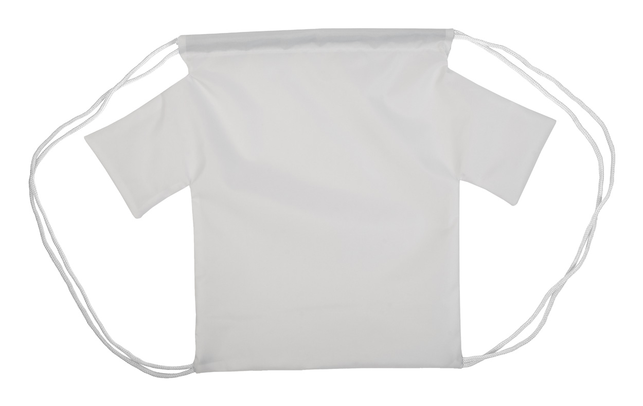 Individueller Turnbeutel in T-Shirt-Design mit farbigen Zugkordeln und vollflächigem Sublimationsdruck. Material: 190T Polyester. Mindestmenge: 25 Stk.