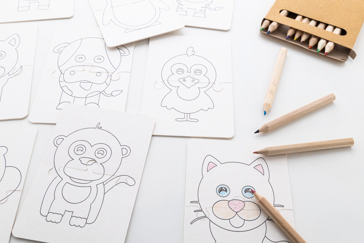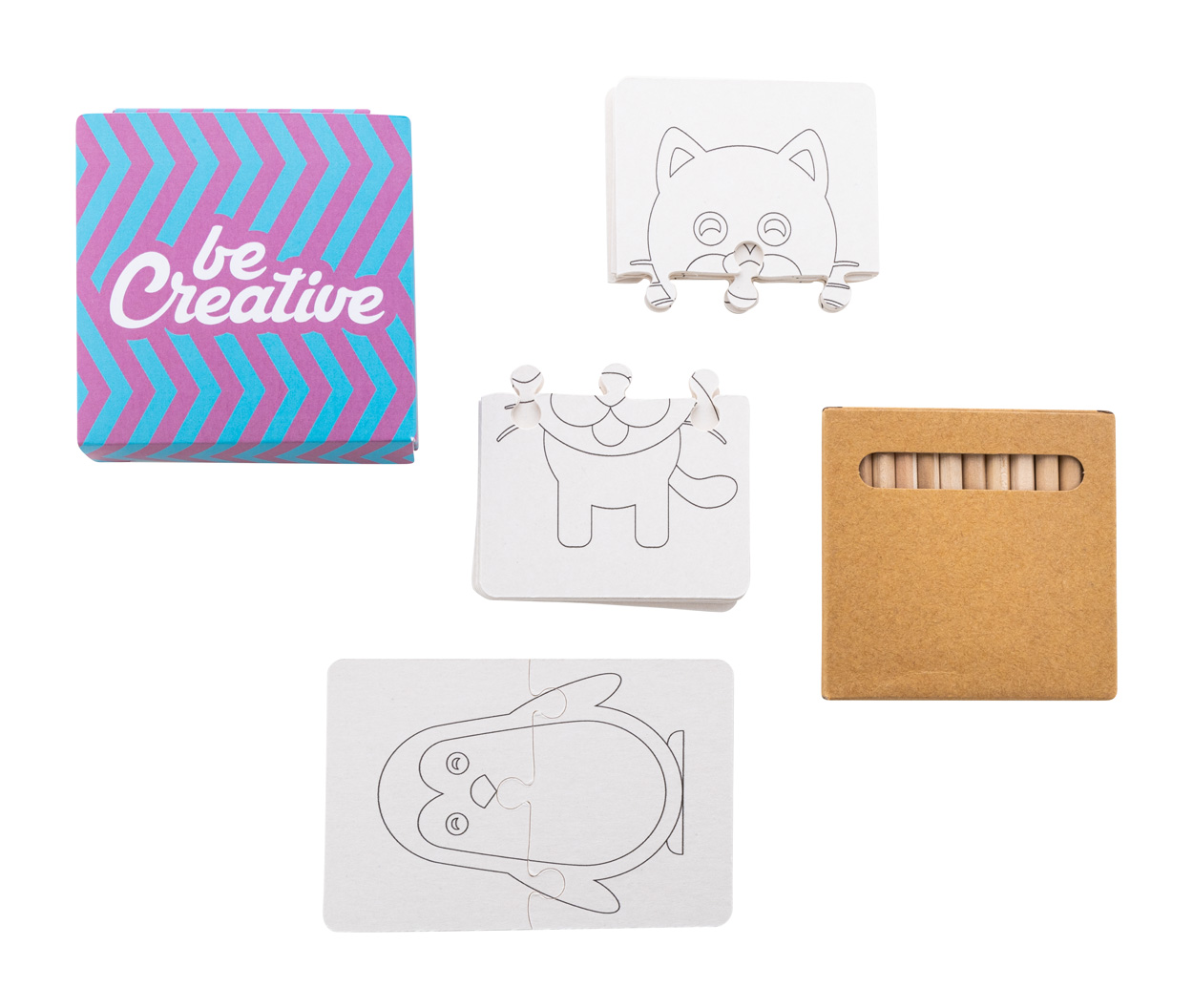 Individuelles Puzzle-Set aus Pappe zum Ausmalen in einer vollfarbig bedruckten Pappschachtel. Inklusive Holzbuntstifte (12 Stück) und 9 zweiteiligen Puzzlekarten mit Tiermotiven. Mindestbestellmenge: 100 Stück.