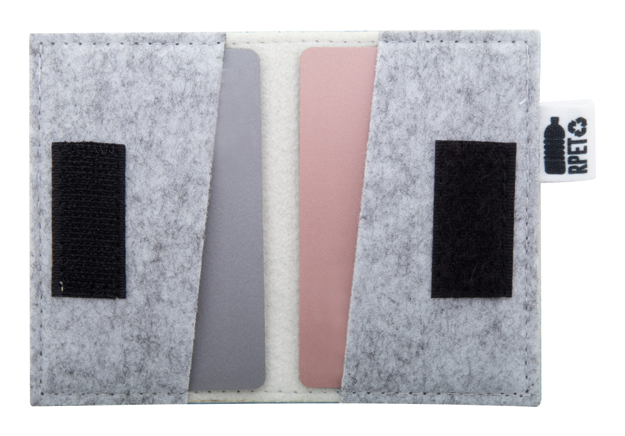 Individuelles Kreditkartenetui mit 2 Kartenfächern und Klettverschluss aus RPET-Filz. Der Preis ist inklusive vollfarbigem vollflächigem Sublimationsdruck auf der Vorderseite. Mindestbestellmenge: 50 Stk.