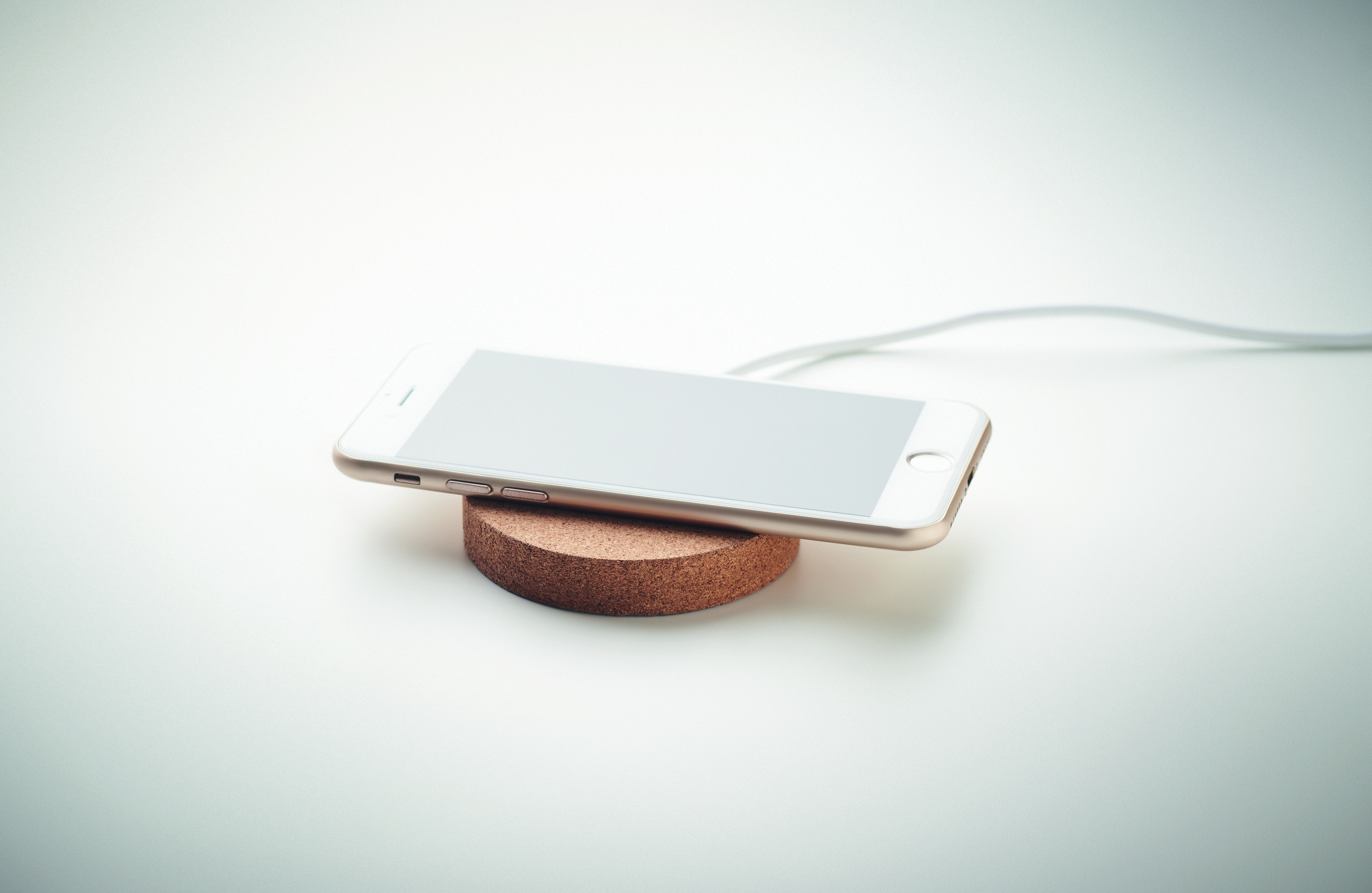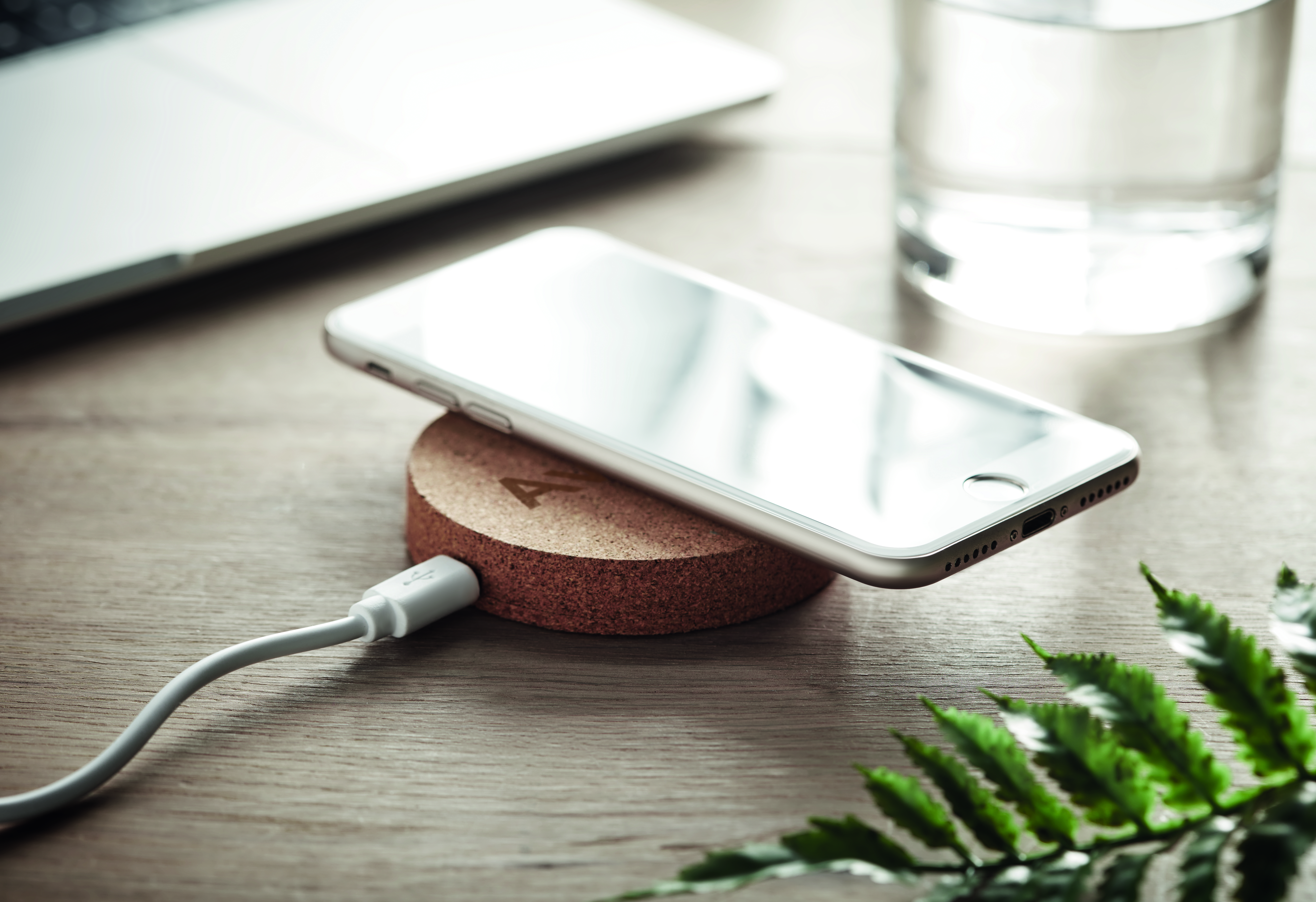 Induktive Ladestation in runder Form aus Kork. Ausgang: DC 9V/1,1A (10W). Kork ist ein 100% natürliches Material. Aufgrund seiner strukturellen Beschaffenheit und Oberflächenporosität kann das endgültige Druckergebnis pro Artikel Abweichungen aufweisen