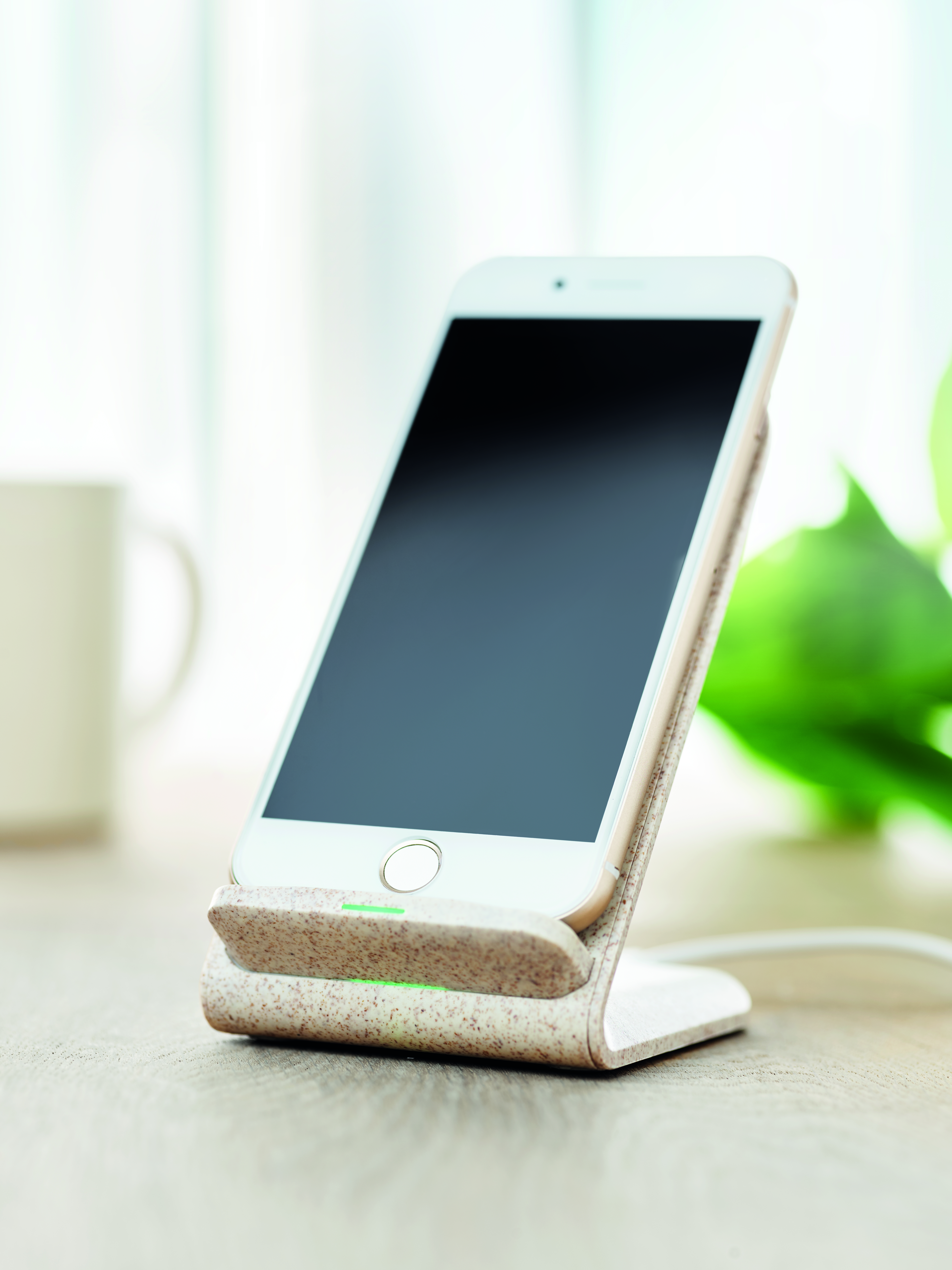 Induktive Ladestation mit Halter aus 35% Weizenstroh und 65% ABS. Verbinden Sie das Gerät mit dem Computer und laden Sie Ihr Smartphone durch einfaches Auflegen auf. Ausgang:DC5V/2A (10W) für schnelles Aufladen.