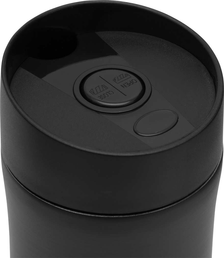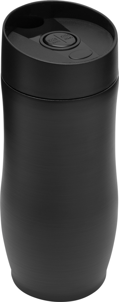 Isolierbecher CLASSICO, doppelwandig: innen und außen aus Edelstahl, Kunststoff-Deckel mit sicherem Schraubverschluss, Push-Button OPEN / CLOSE und integrierter Trinköffnung, gummierter Standfuß für gute Bodenhaftung, Füllmenge ca. 380 ml
