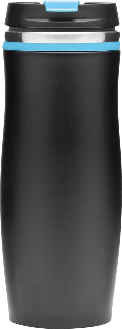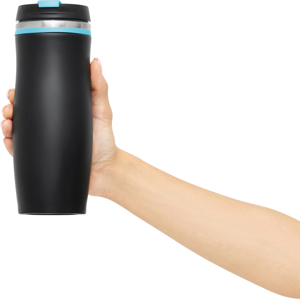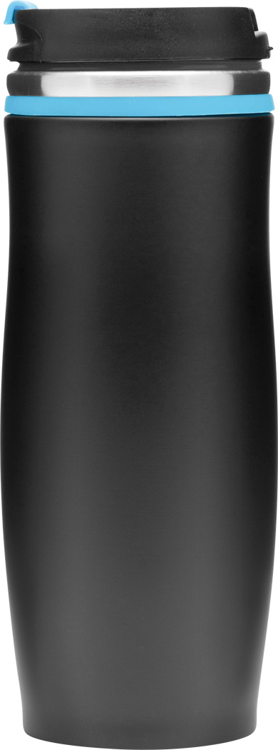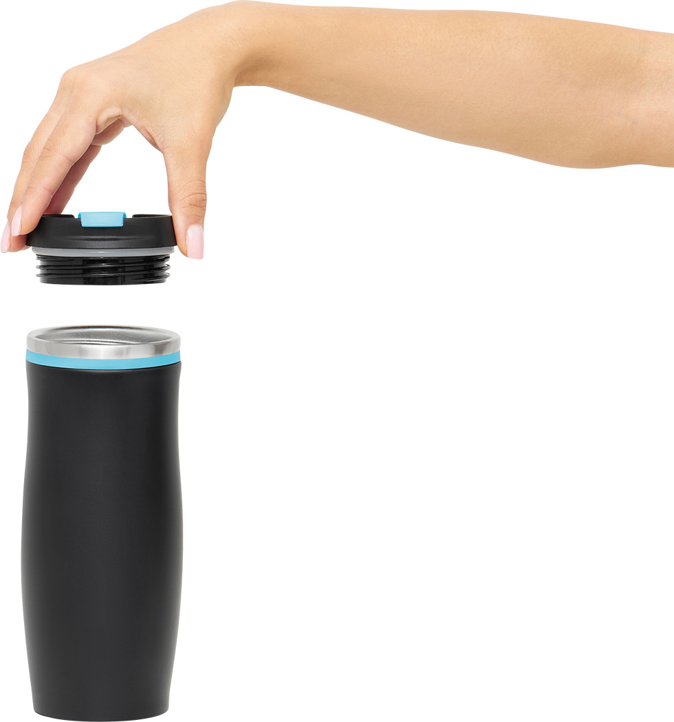 Isolierbecher DARK CREMA, doppelwandig: innen und außen aus Edelstahl, Kunststoff-Deckel mit sicherem Schraubverschluss und integrierter Trinköffnung zum Aufklappen, farbig-gummierte Manschette oben sowie gummierter Standfuß für gute Bodenhaftung, Füllmenge ca. 400 ml