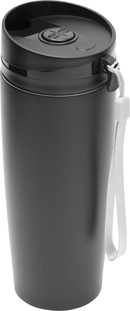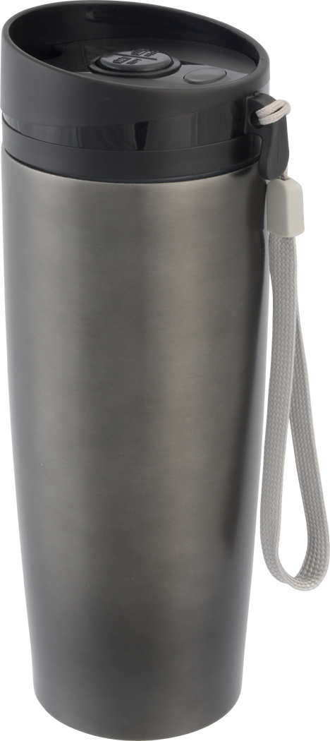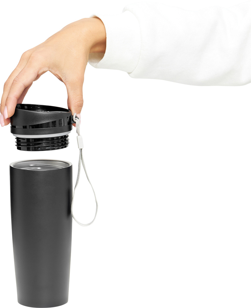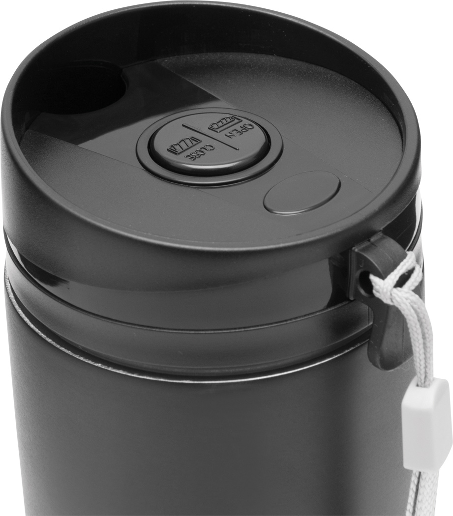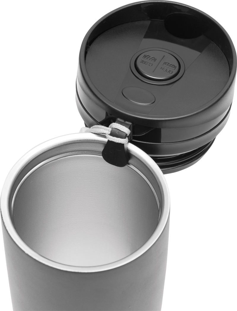 Isolierbecher EARLY MORNING, doppelwandig: innen und außen aus Edelstahl, Kunststoff-Deckel mit sicherem Schraubverschluss, Pushbutton OPEN / CLOSE und integrierter Trinköffnung, gummierter Standfuß für gute Bodenhaftung, Füllmenge ca. 380 ml, mit Handschlaufe