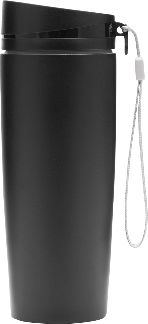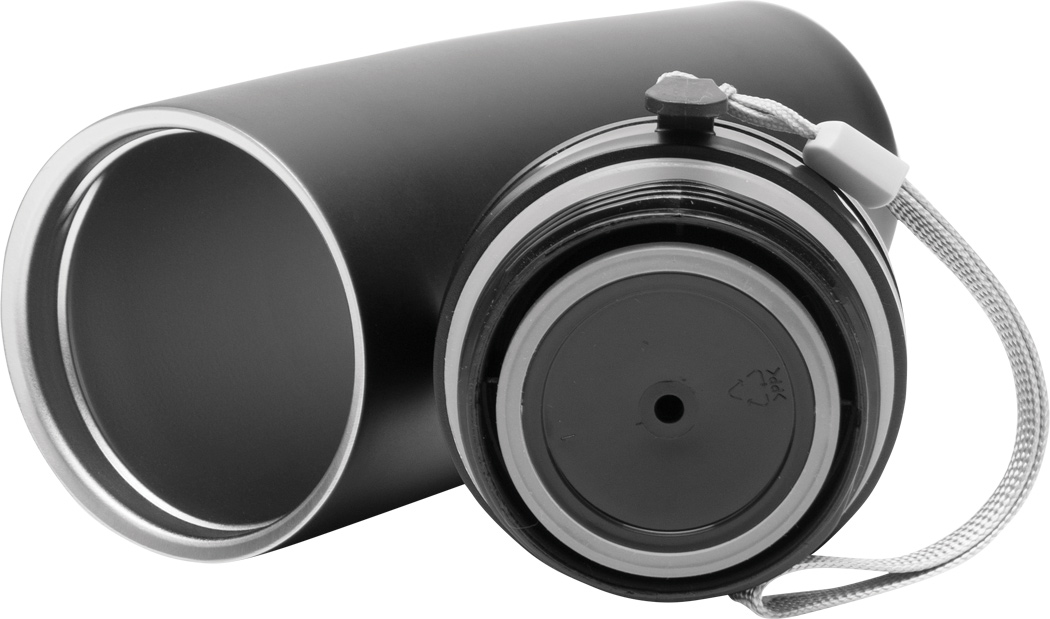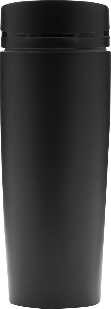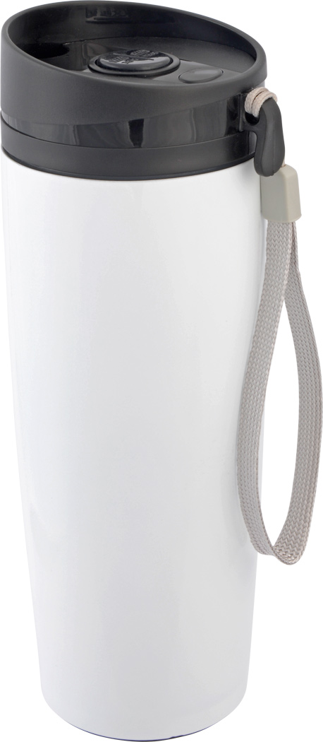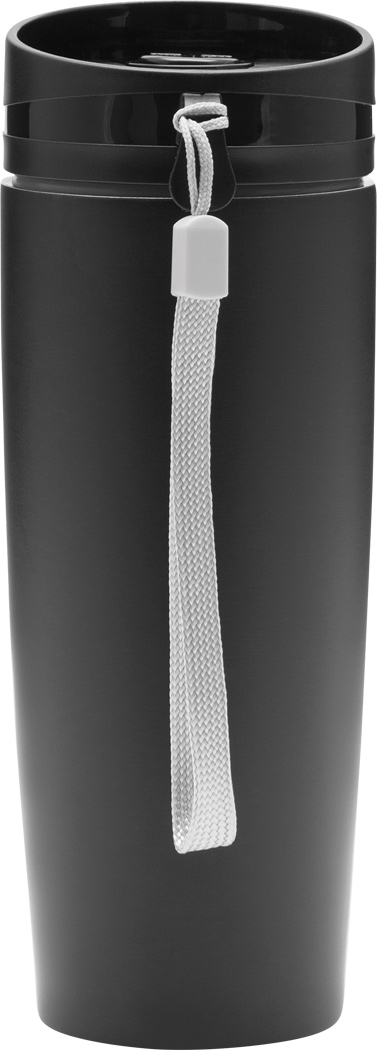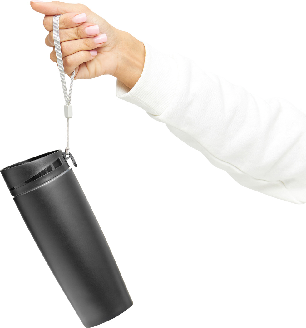 Isolierbecher EARLY MORNING, doppelwandig: innen und außen aus Edelstahl, Kunststoff-Deckel mit sicherem Schraubverschluss, Pushbutton OPEN / CLOSE und integrierter Trinköffnung, gummierter Standfuß für gute Bodenhaftung, Füllmenge ca. 380 ml, mit Handschlaufe