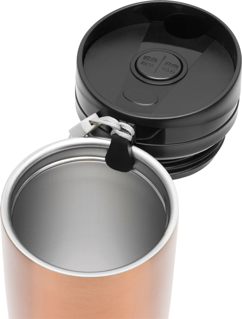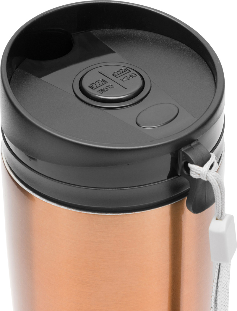 Isolierbecher EARLY MORNING, doppelwandig: innen und außen aus Edelstahl, Kunststoff-Deckel mit sicherem Schraubverschluss, Pushbutton OPEN / CLOSE und integrierter Trinköffnung, gummierter Standfuß für gute Bodenhaftung, Füllmenge ca. 380 ml, mit Handschlaufe, in Box