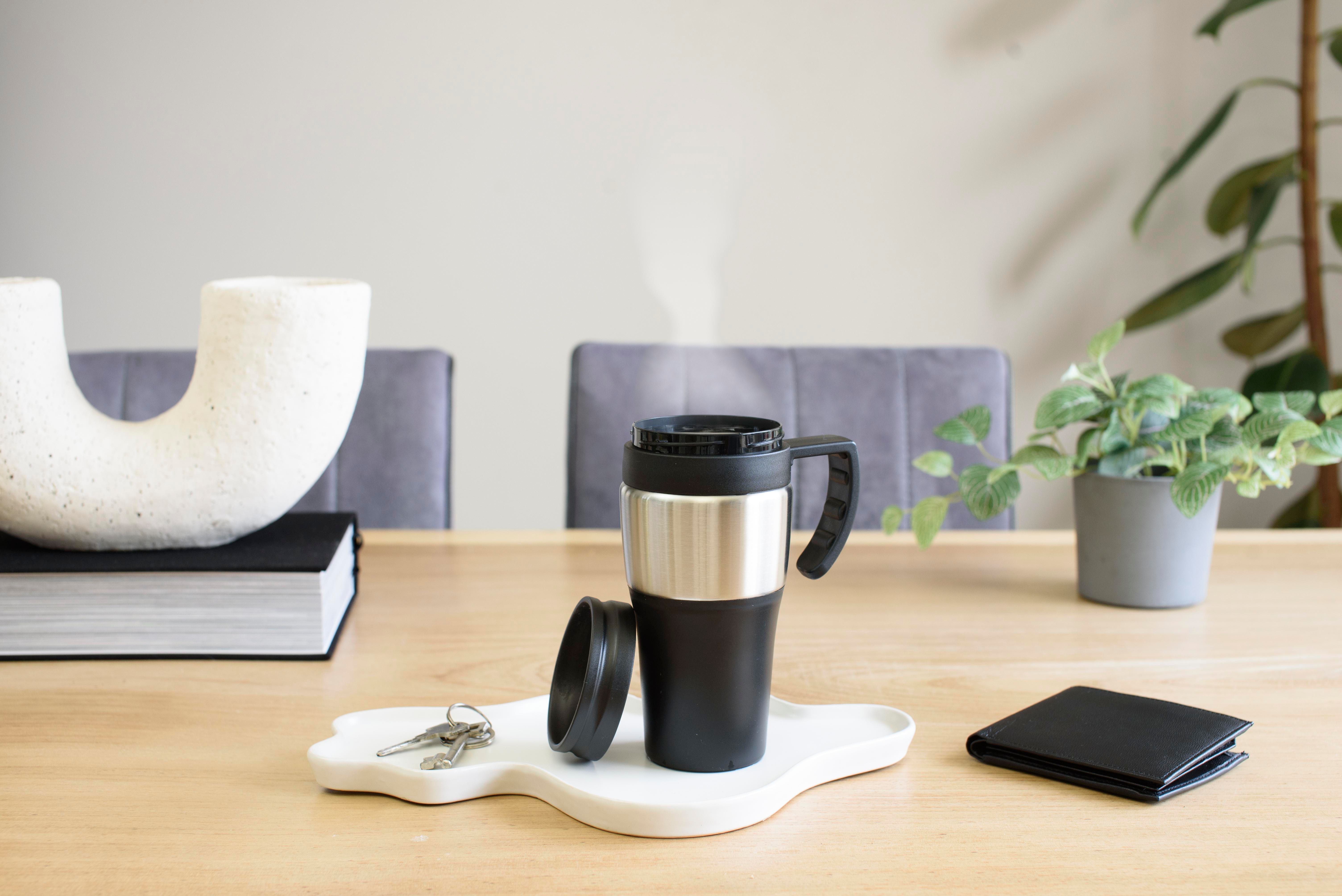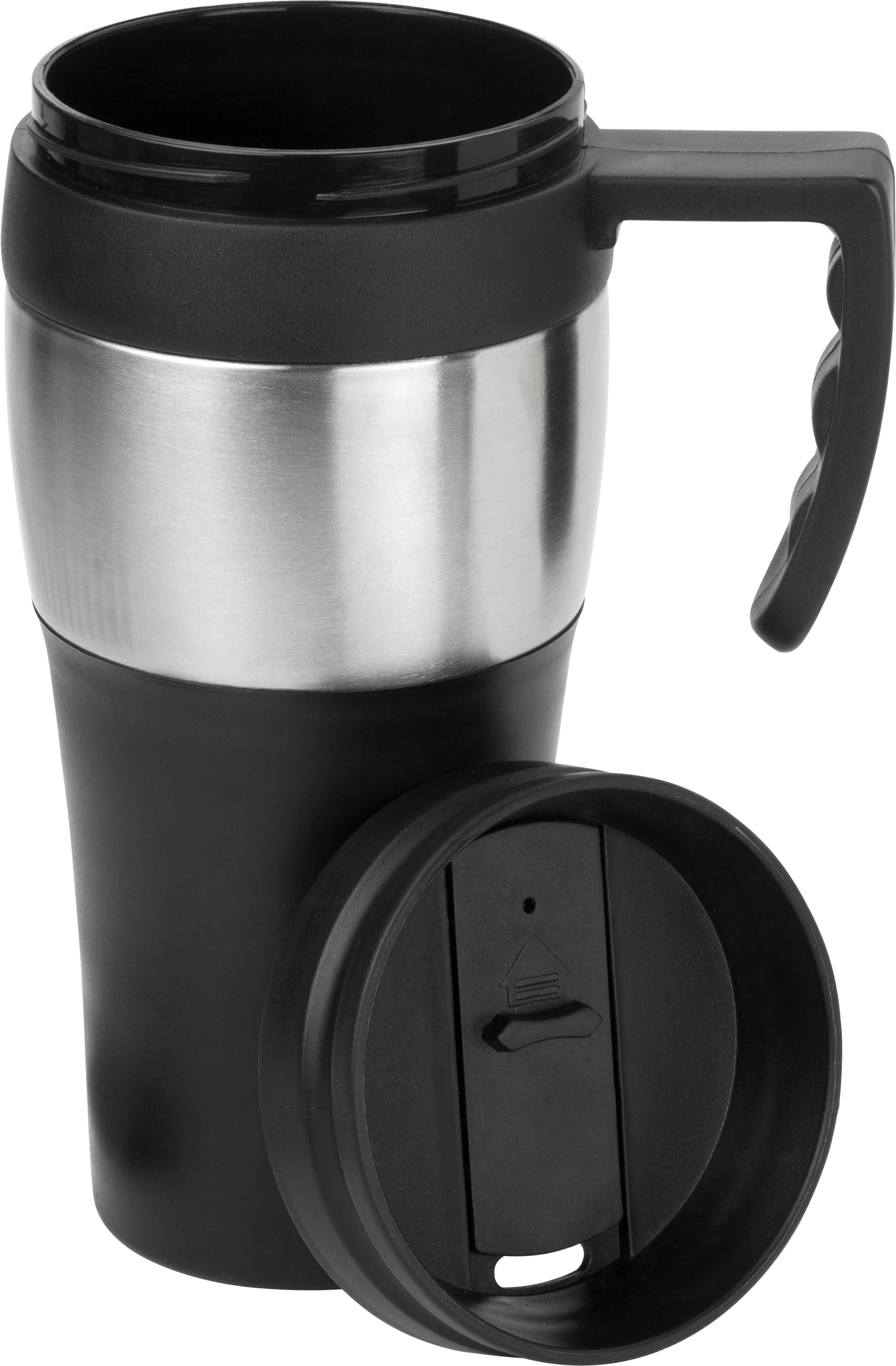 Isolierbecher aus Kunststoff, mit Applikation aus Edelstahl, verschließbarem Mundstück, Inhalt ca. 500 ml.