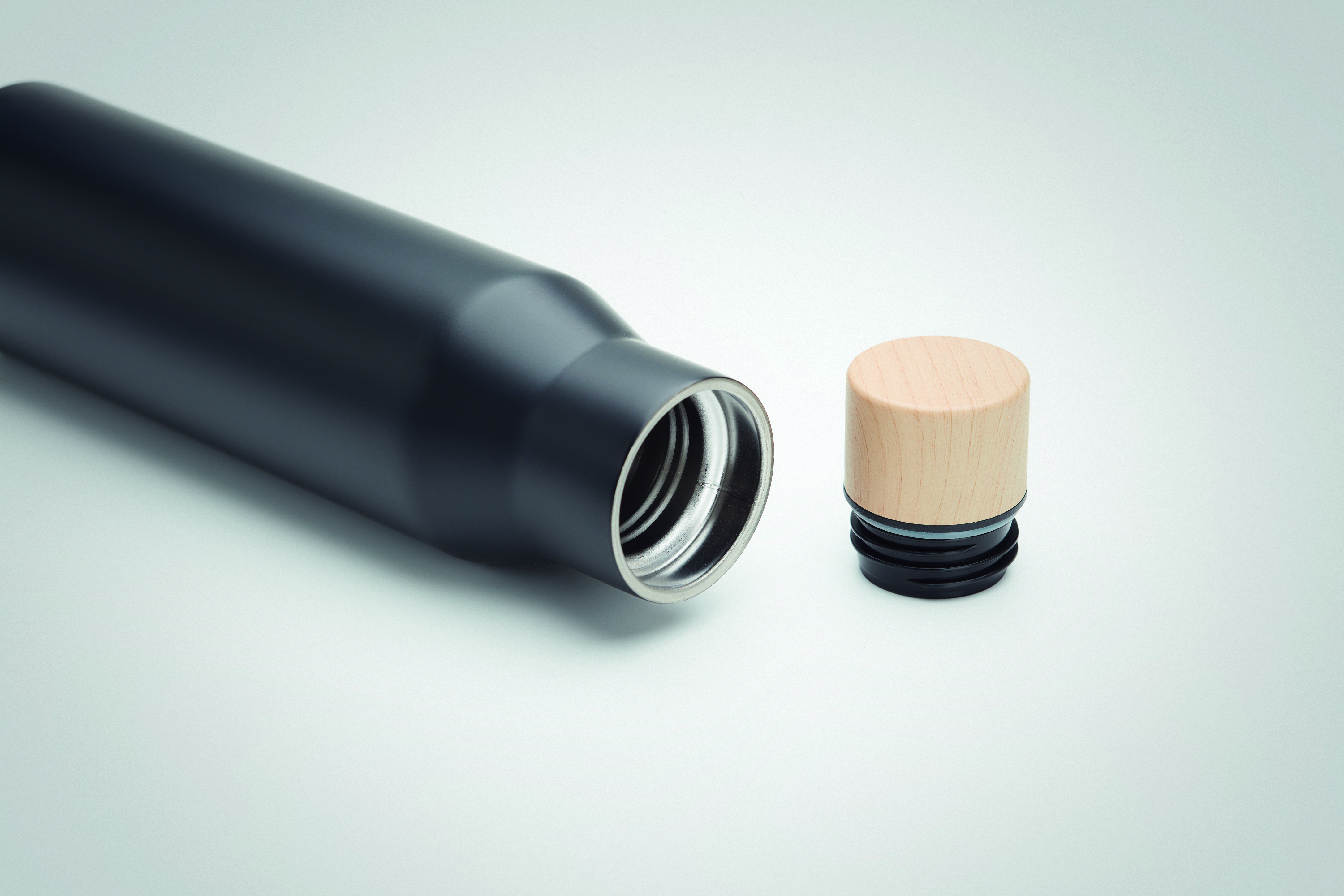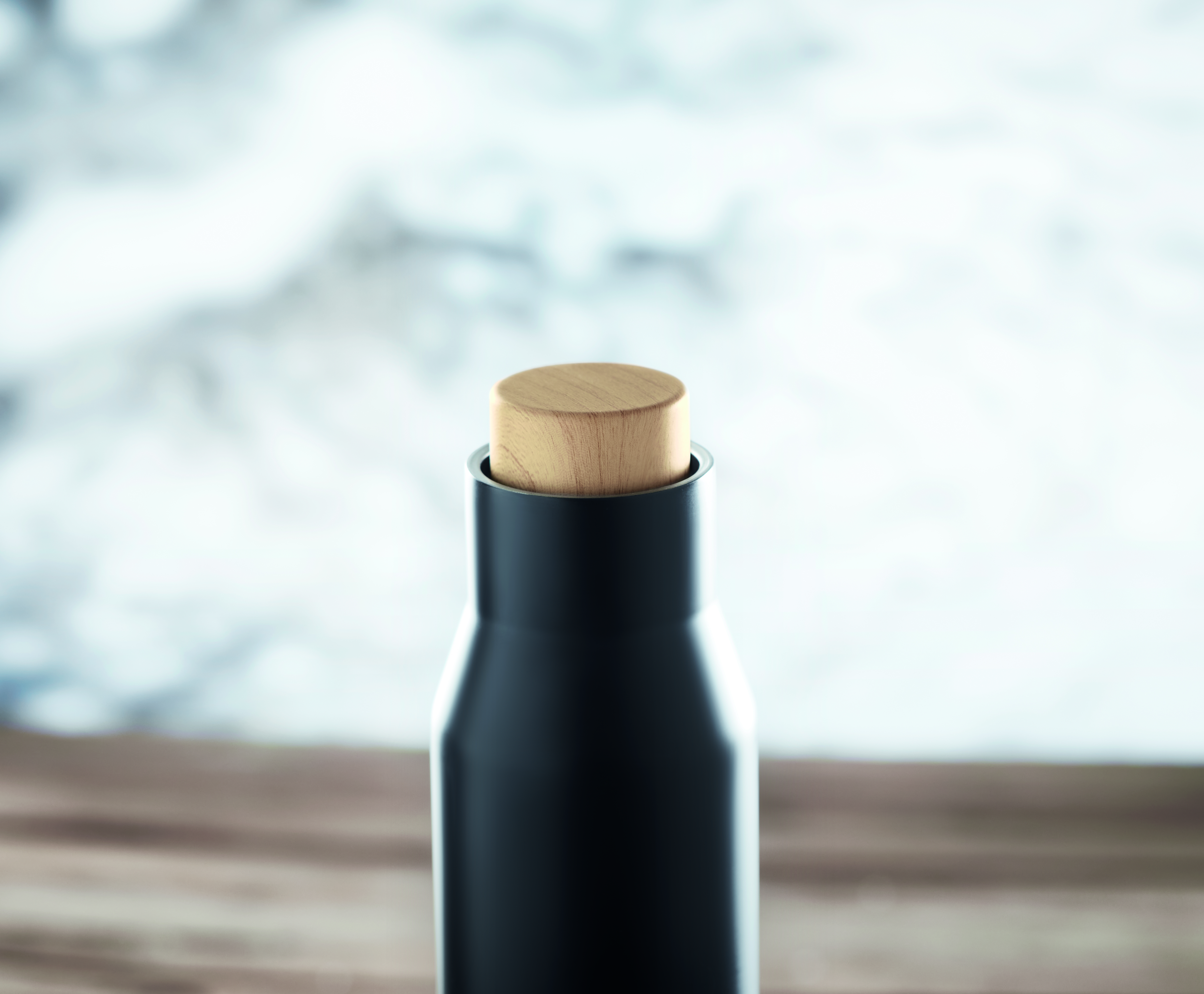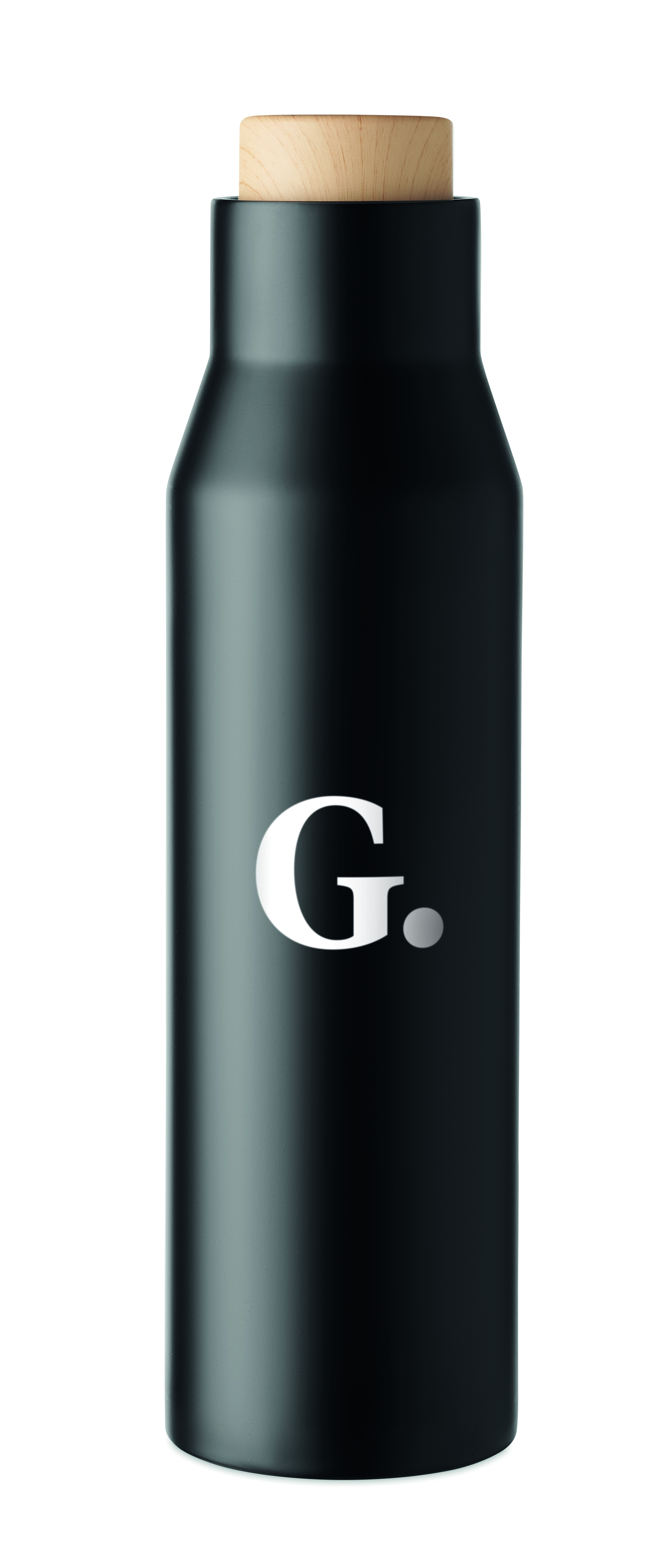 Doppelwandige Isolierflasche aus Edelstahl. Verschluss aus Bambus- Imitat. Füllmenge: 500 ml. Auslaufsicher.