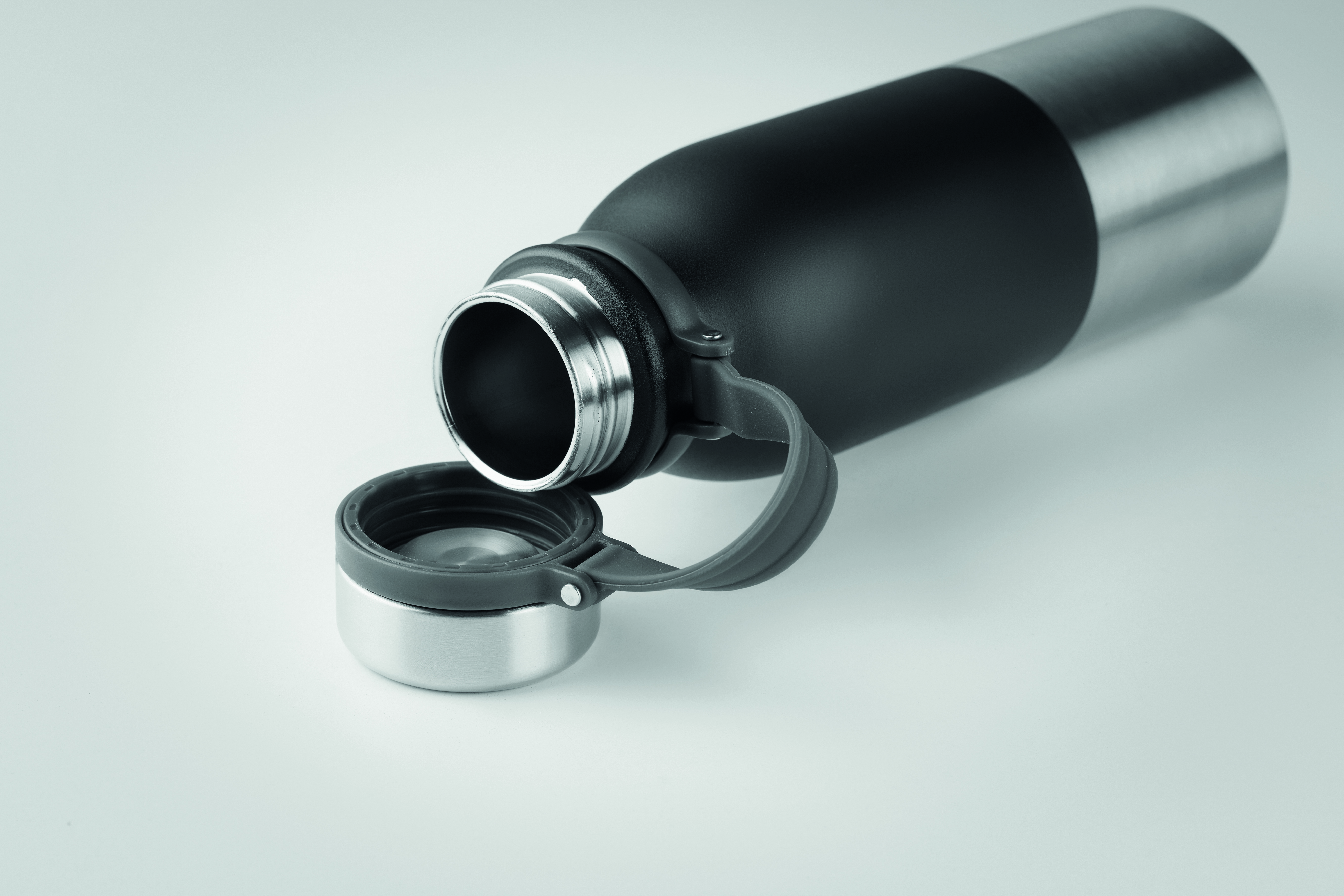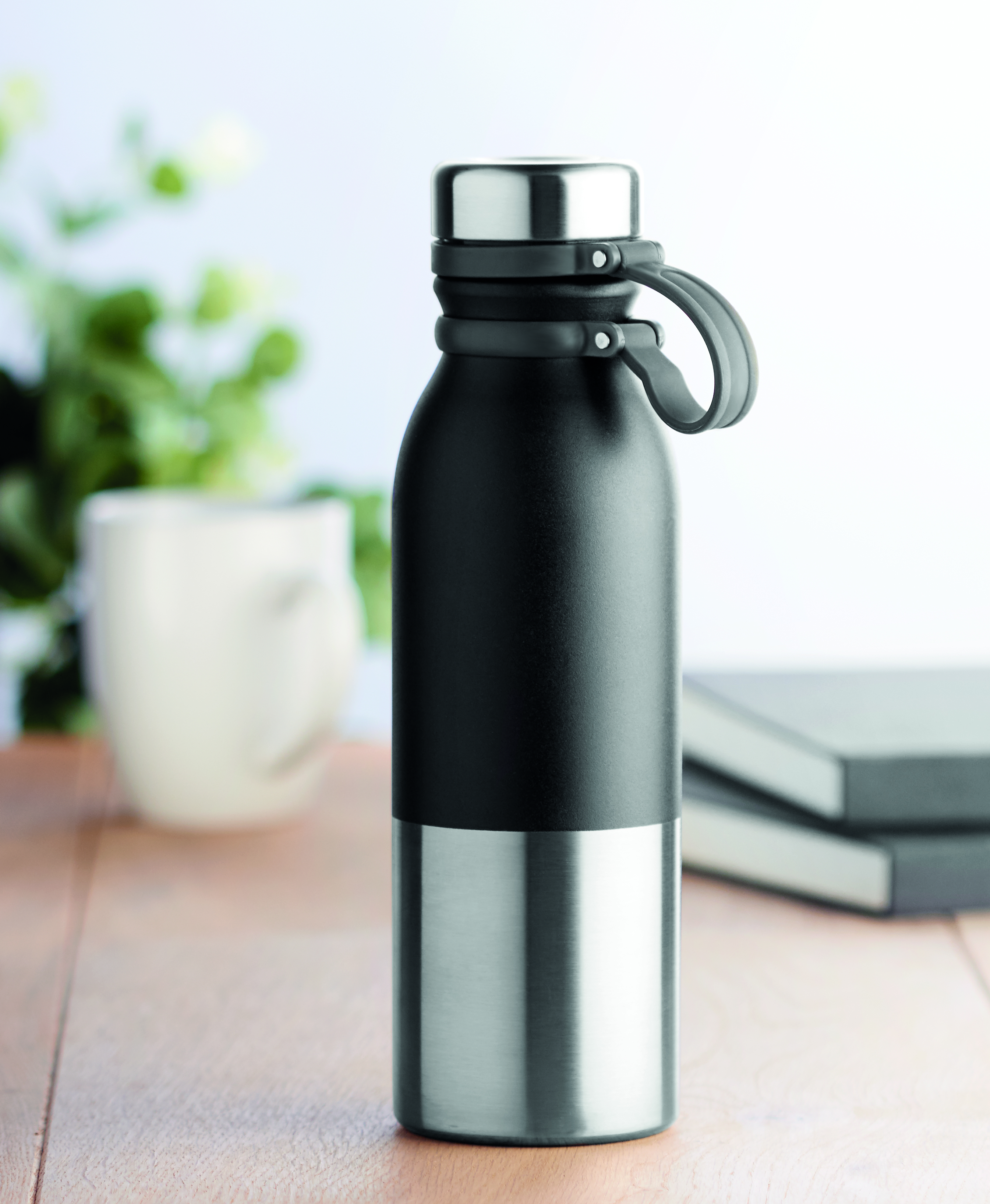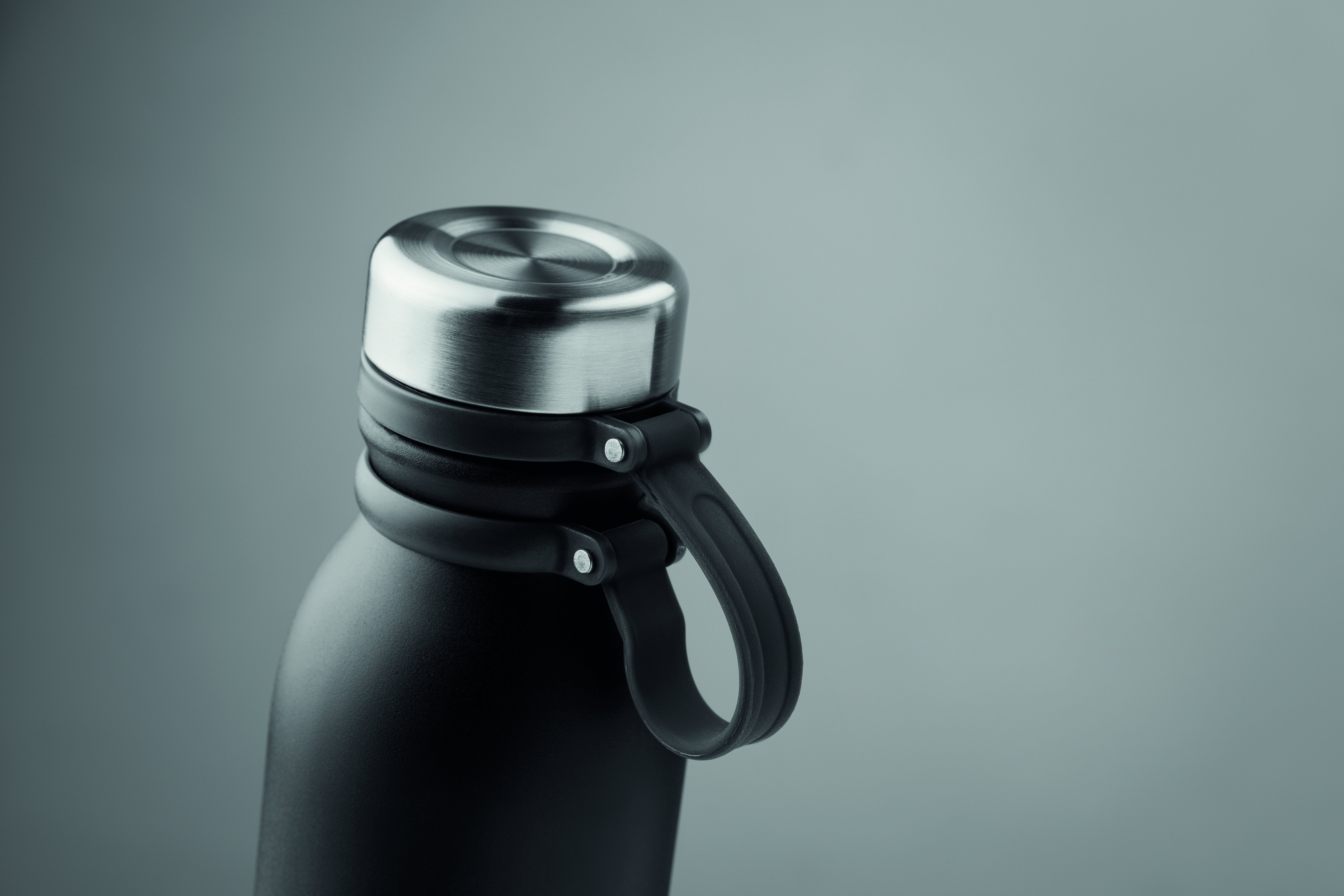 Doppelwandige Isolierflasche aus Edelstahl mit Silikonbeschichtung. Füllmenge: 600 ml. Auslaufsicher.