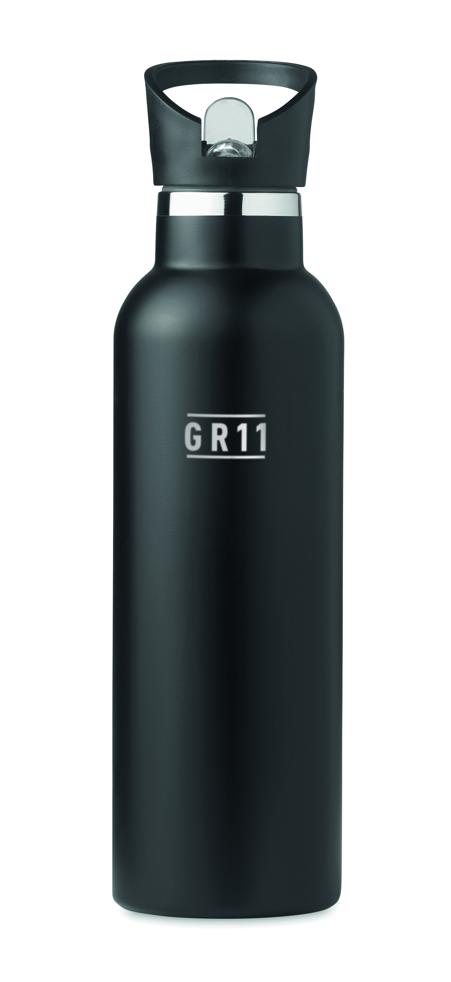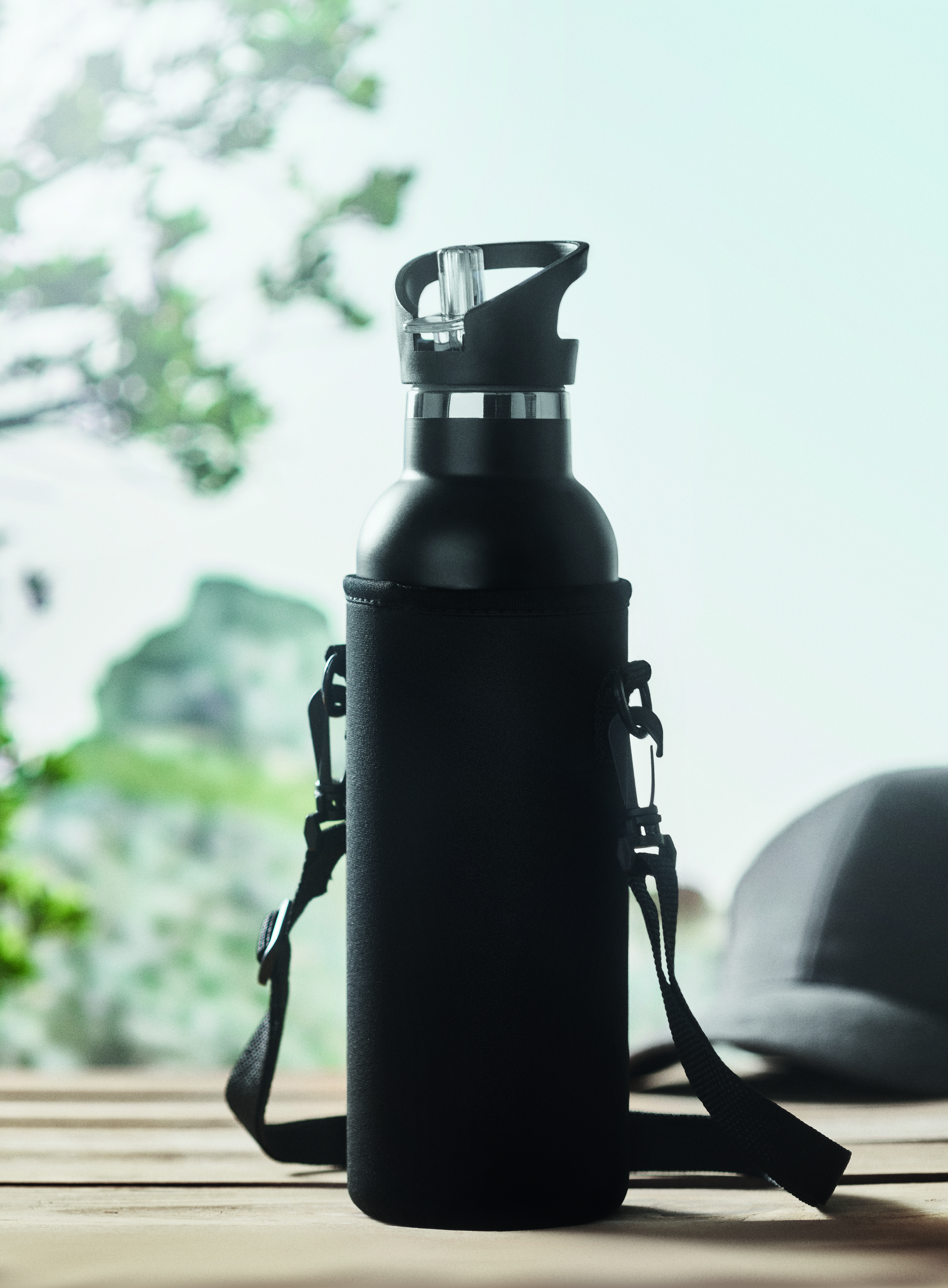 Doppelwandige Isolierflasche aus Edelstahl. Auslaufsicherer Schraubverschluss und separater auswechselbarer Deckel mit Mundstück. Inkl. Tragetasche aus Neopren. Füllmenge: 700 ml.
