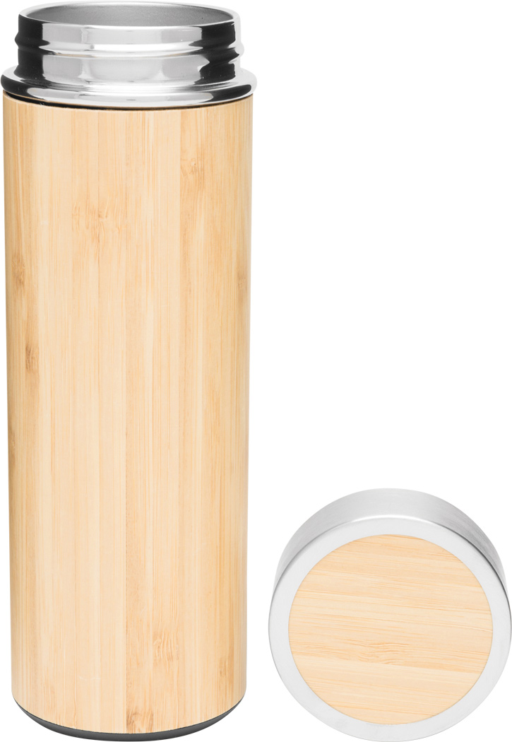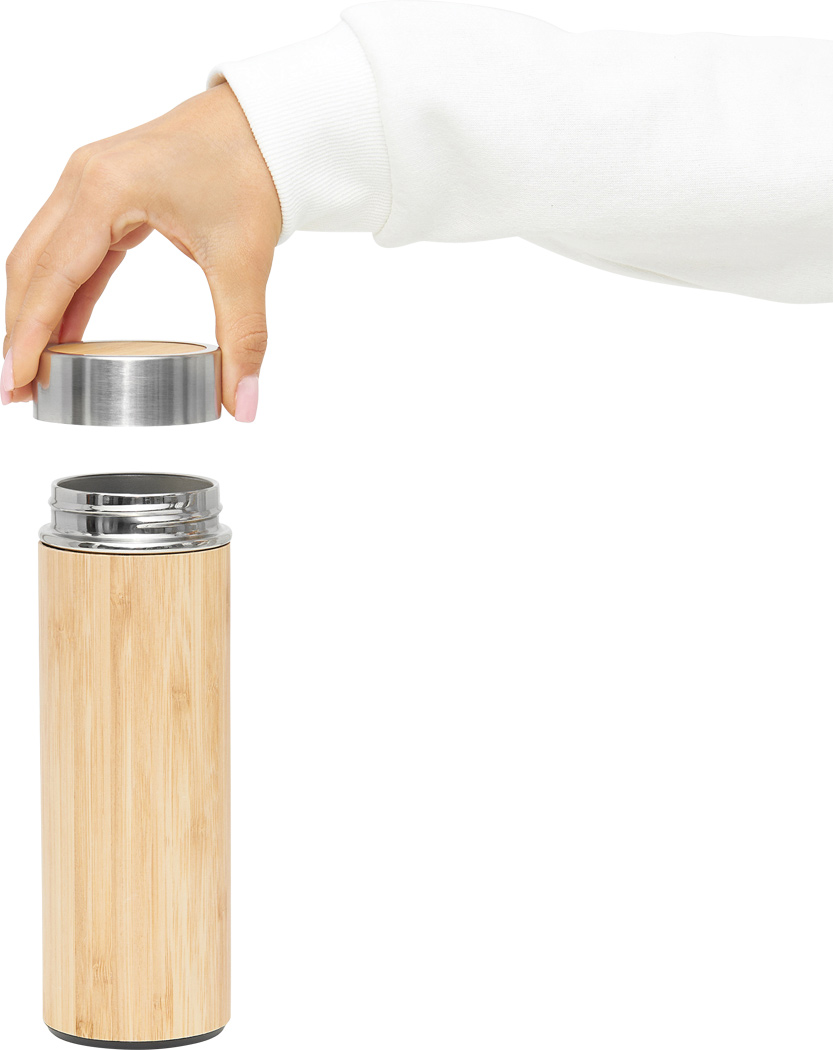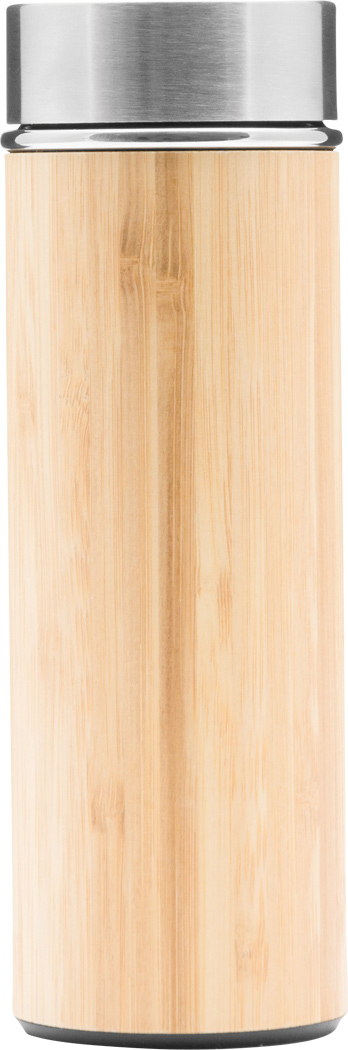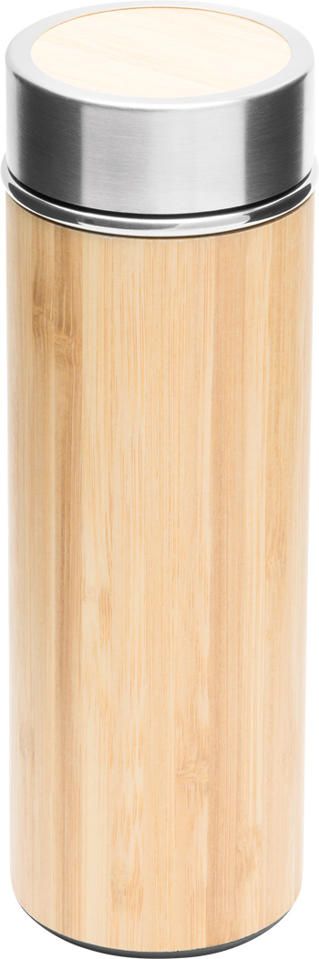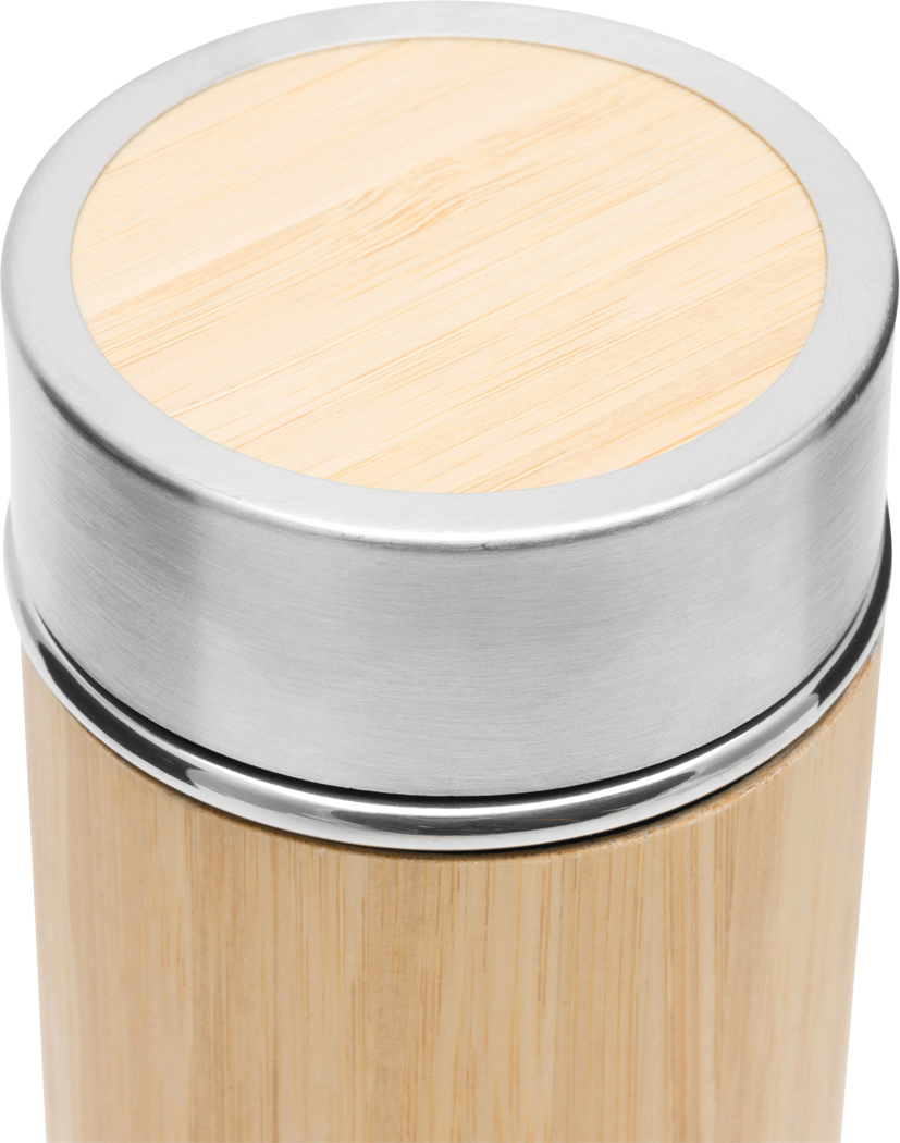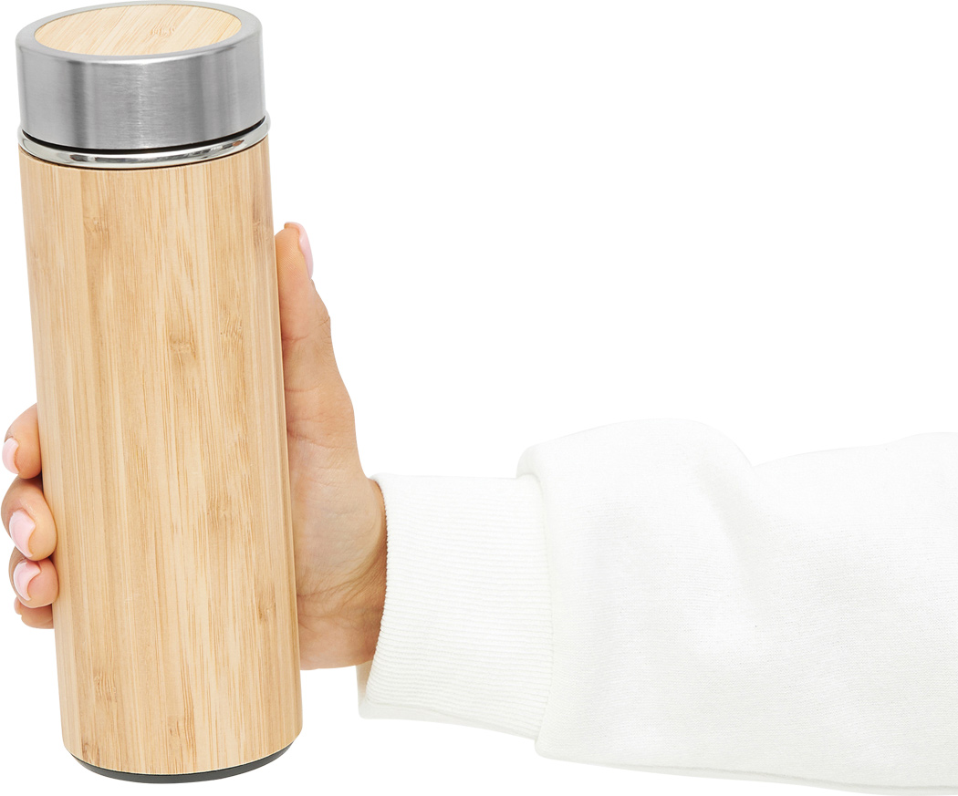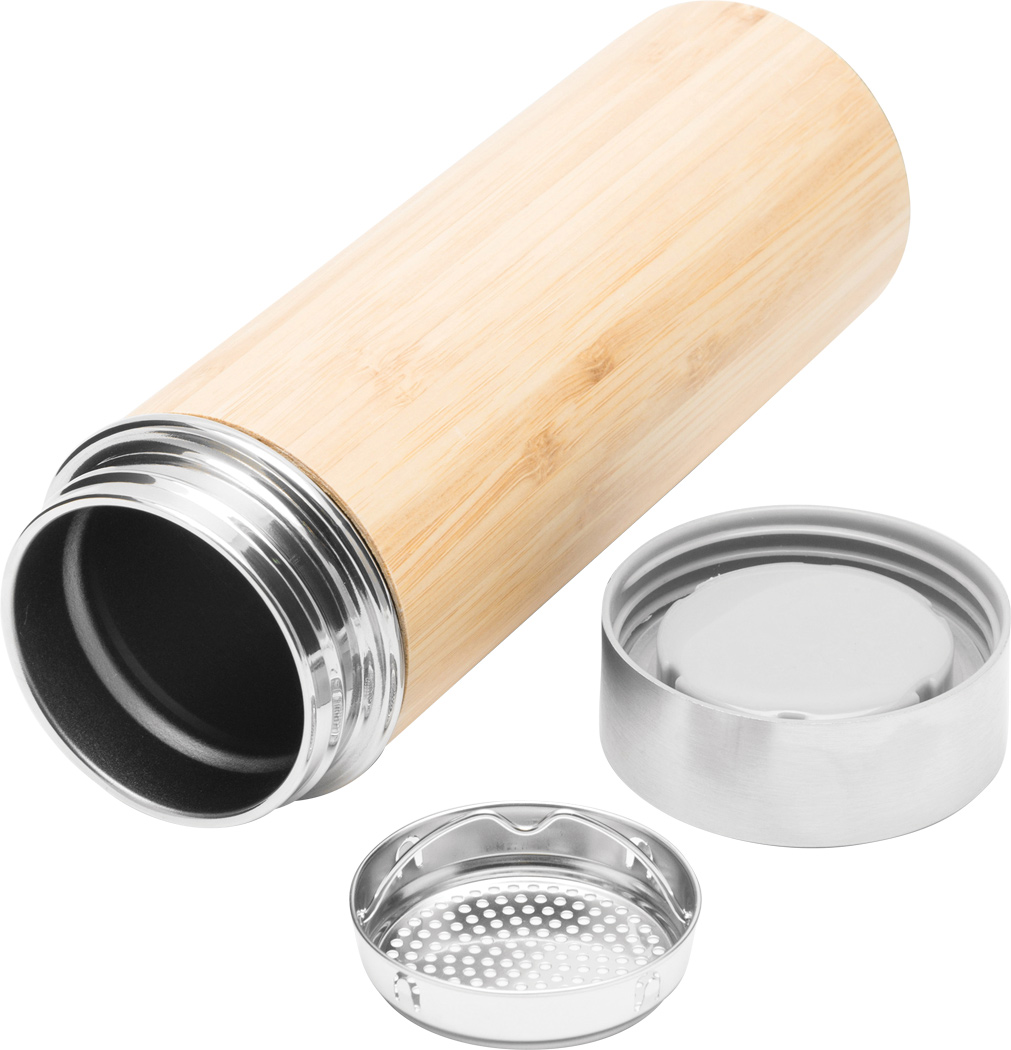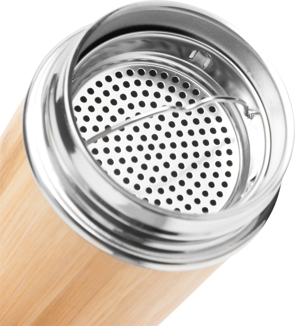 Vakuum-Isolierflasche BAMBOO GO, doppelwandig: innen und außen aus Edelstahl, mit Bambus-Ummantelung, Deckel mit sicherem Schraubverschluss und Silikondichtung, mit herausnehmbarem Teesieb, Füllmenge ca. 350 ml