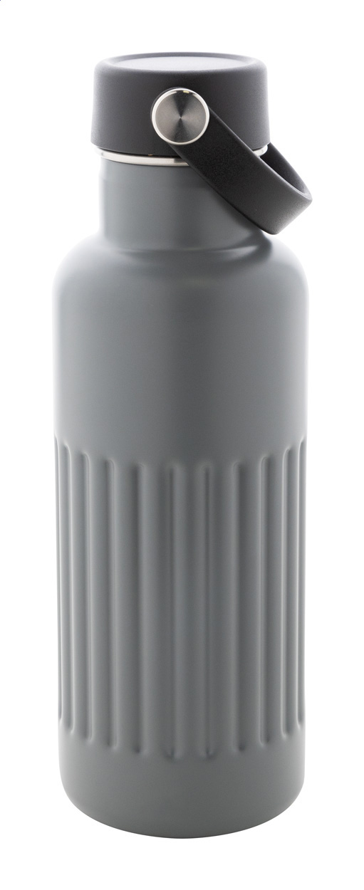 Doppelwandige, recycelte Edelstahl-Trinkflasche mit Vakuumisolierung und PP-Kunststoff-Trageverschluss. Füllmenge: 500 ml.
