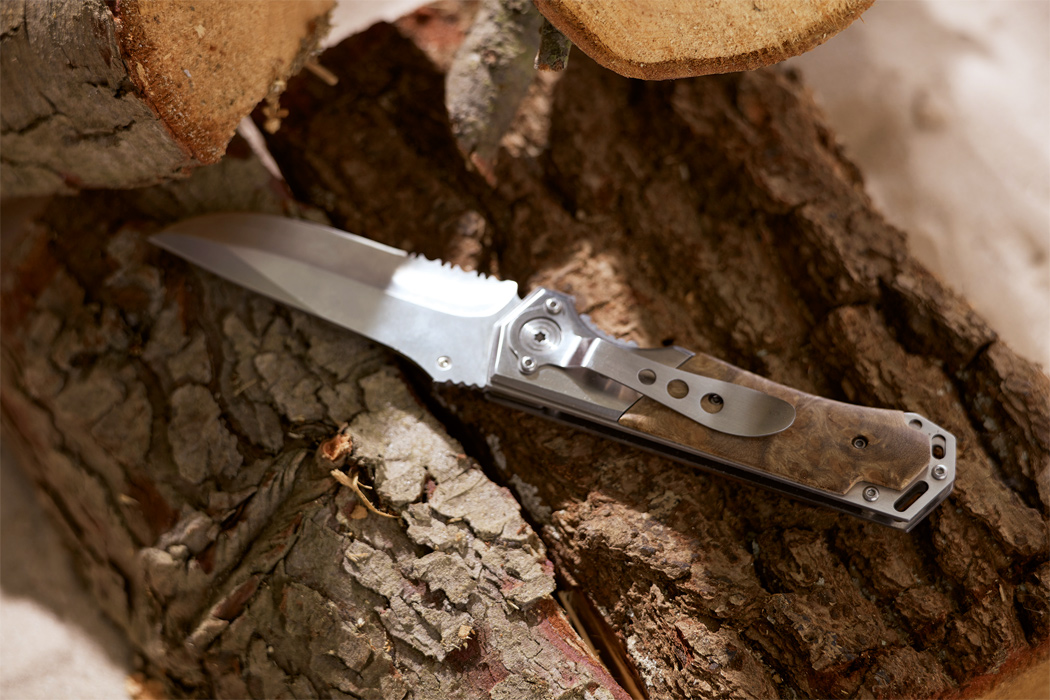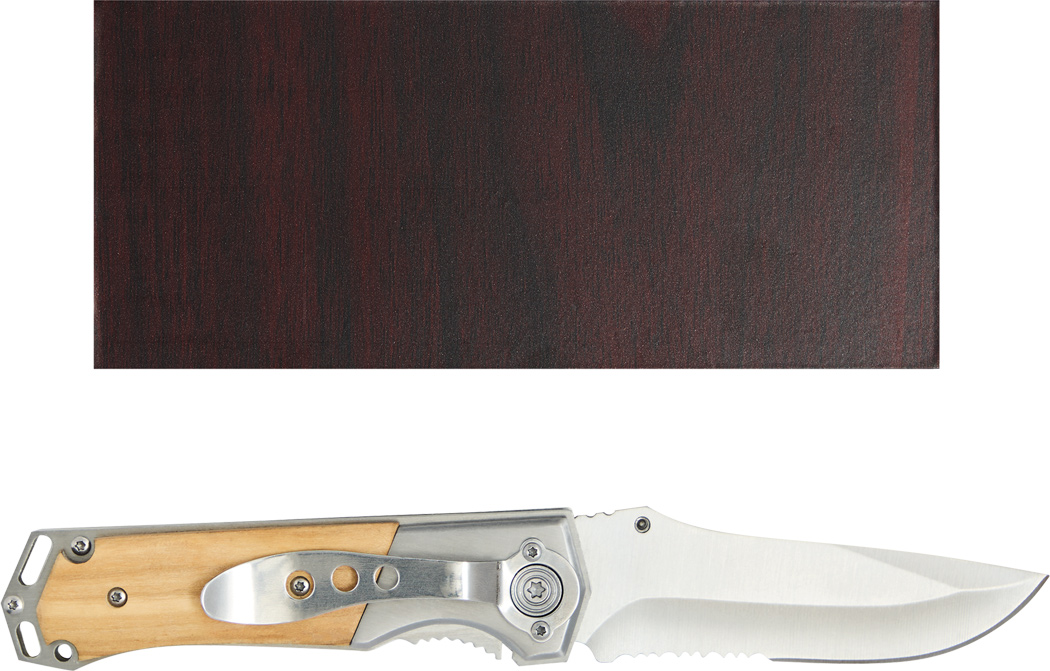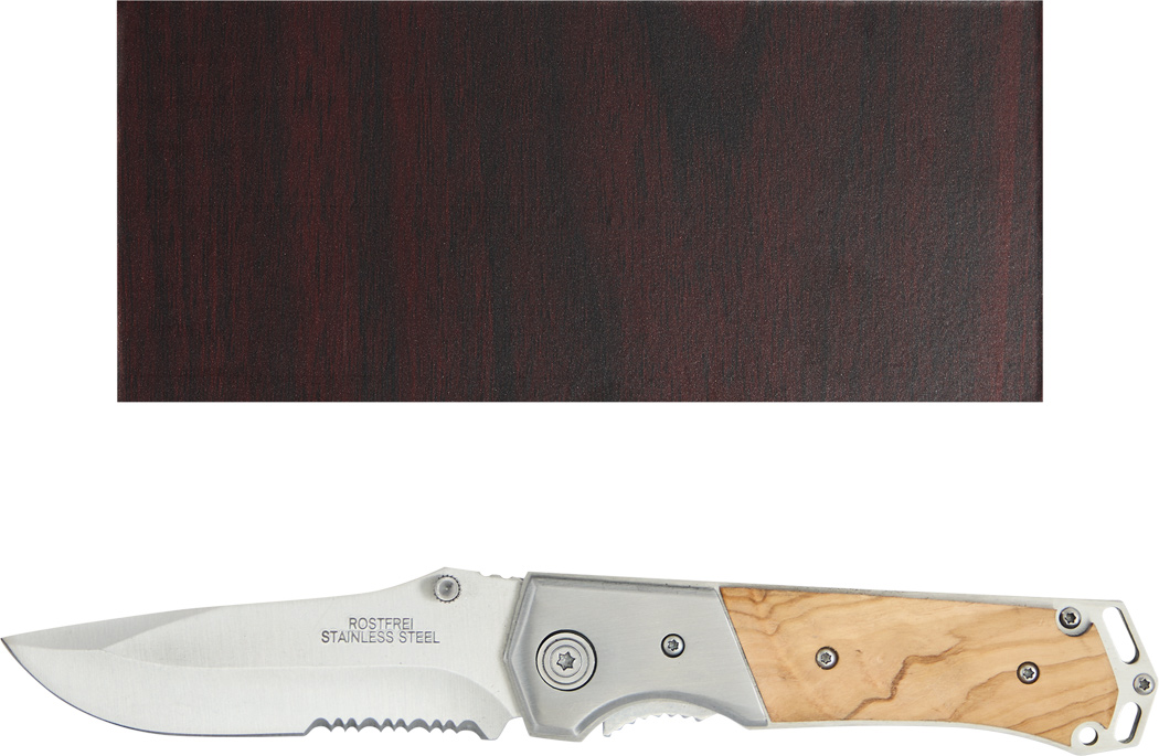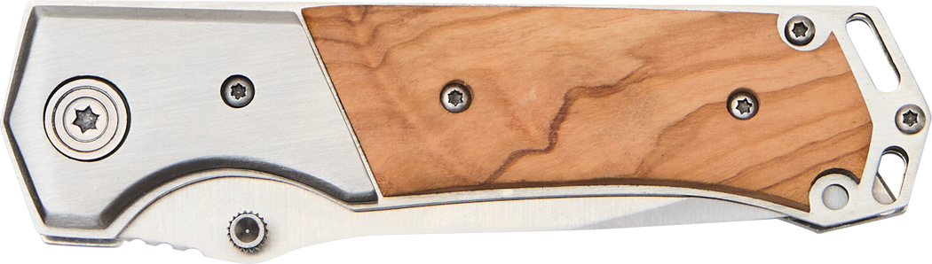 Taschenmesser HUNTER: mit Klappmechanismus, breiter Klinge aus Edelstahl, Holzapplikation am Griff und Gürtel-Clip, im Holzetui