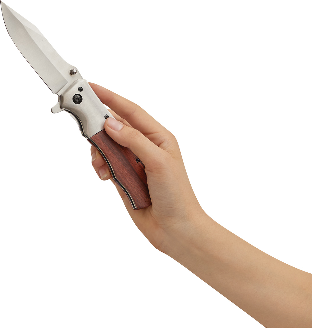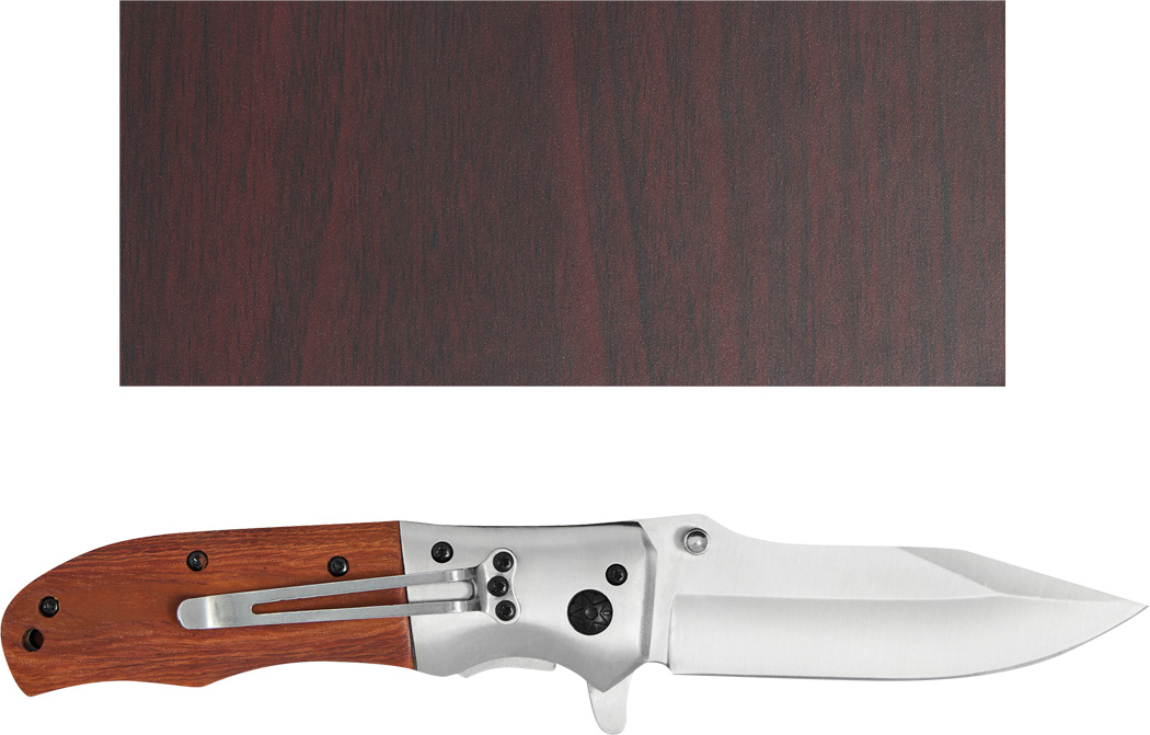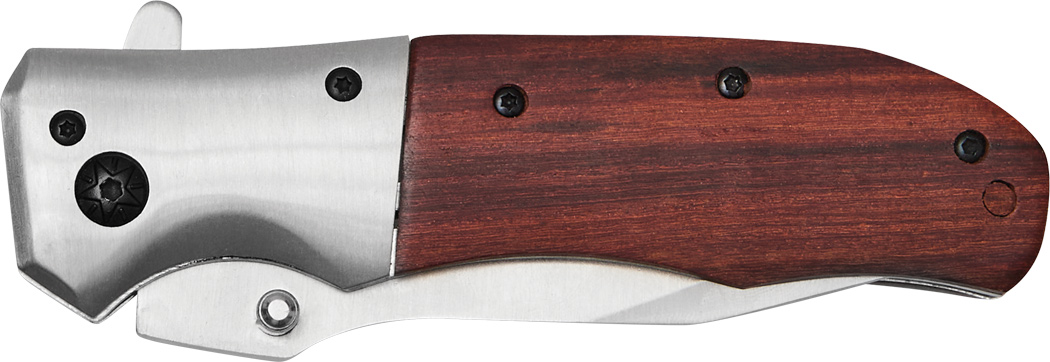 Jagdmesser HUNTSMAN: breite Edelstahlklinge, Holzapplikation am Griff, mit Gürtelclip, im Holzetui