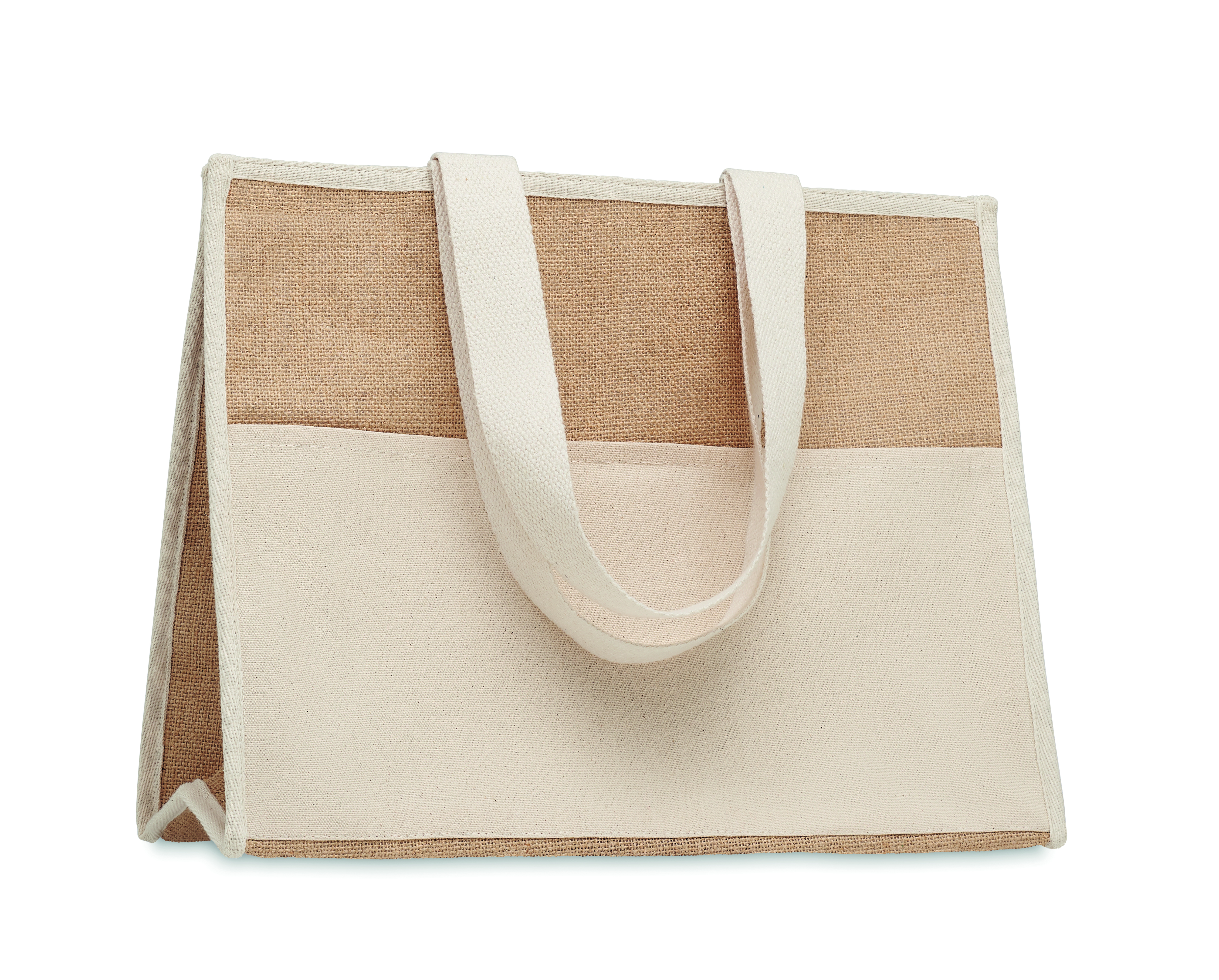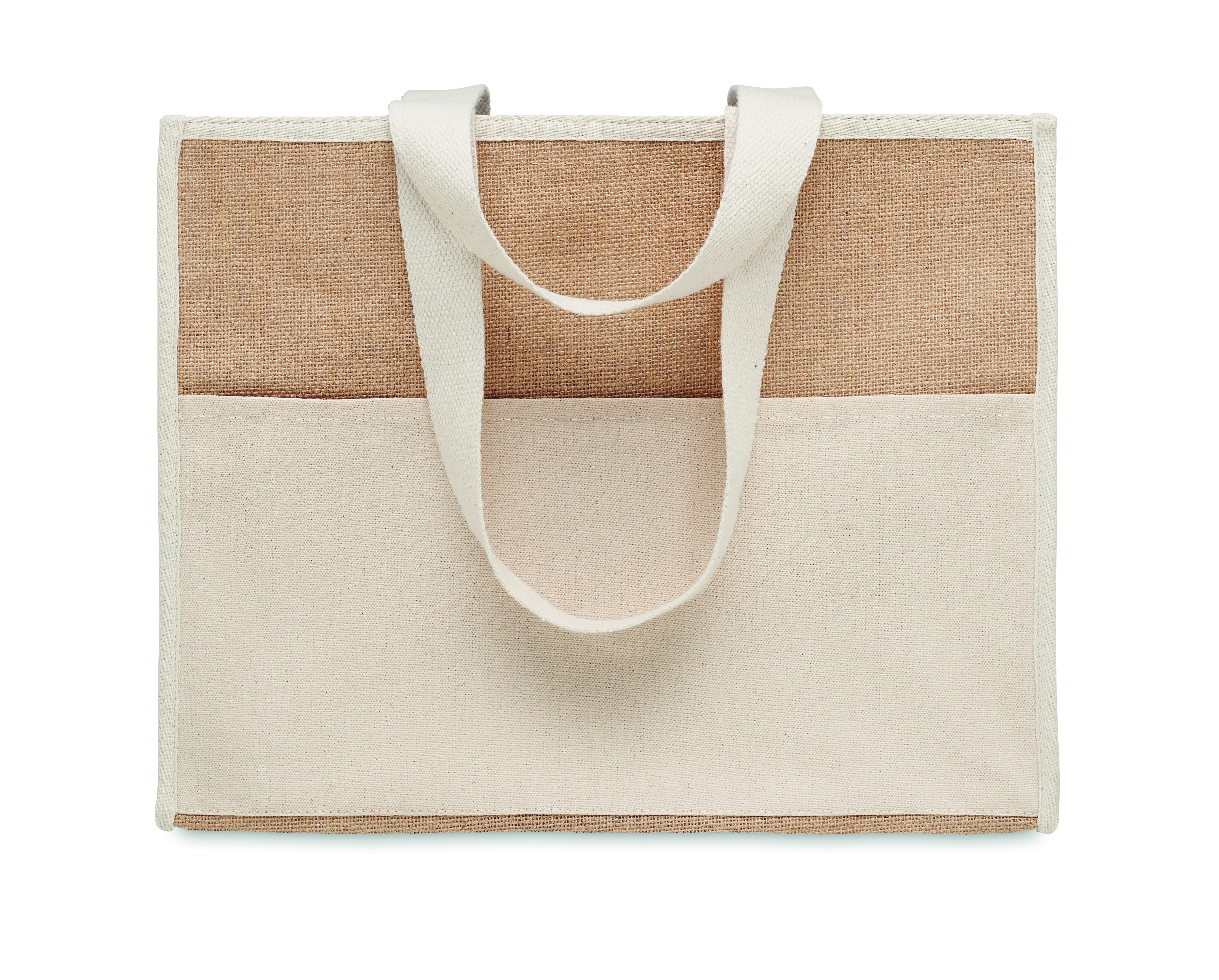Diese Shopping Tasche aus Jute hat lange Tragegriffe. Das Innere ist laminiert, um Ihre Einkäufe frisch zu halten. Sie kann per Klettverschluss geschlossen werden. Auf der Vorderseite befindet sich eine Tasche aus Canvas für kleinere Gegenstände. Diese Jutetasche ist perfekt für den täglichen Einkauf von Lebensmitteln. Sie hat eine lange Lebensdauer und ist somit eine großartige Alternative zu Einweg- Plastiktüten. Dieses Produkt ist nach OEKO-TEX® STANDARD 100 zertifiziert.