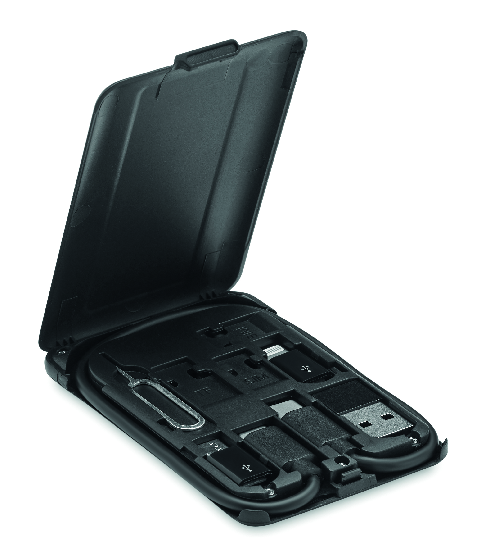 Multifunktionales Kabel-Set mit kabellosem Ladegerät 15 W. Beinhaltet Typ-C zu Typ-C mit Adapter zu Mikro-B, 2in1 Pin, Typ-C auf AC-Adapter, SIM-Auswurftool und Slot für 2 Nano Sim und 1 TF-Karte. Inkl. Smartphone-Halter.