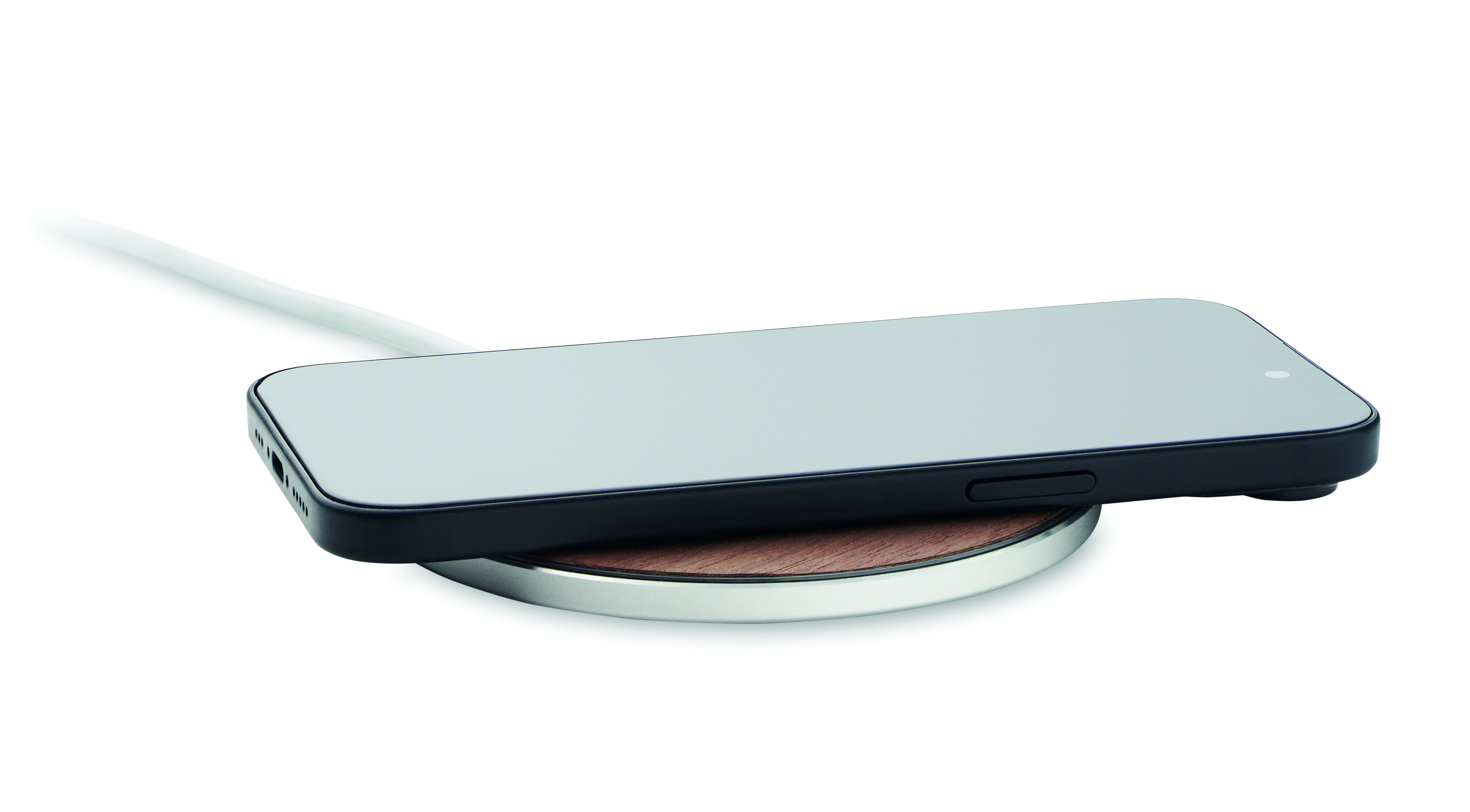 Kabellose Ladestation. Recyceltes Aluminium mit Details aus Walnussholz. Ausgang: DC 9V/1.67A (15W).