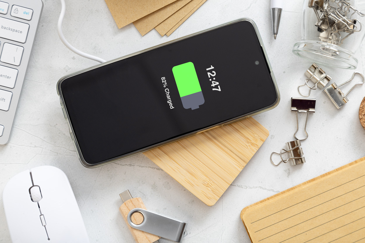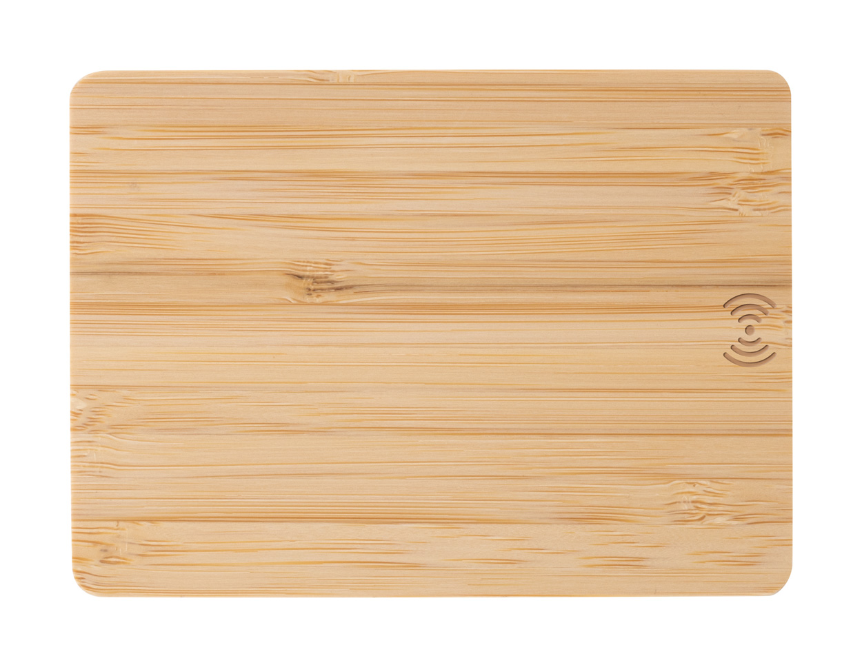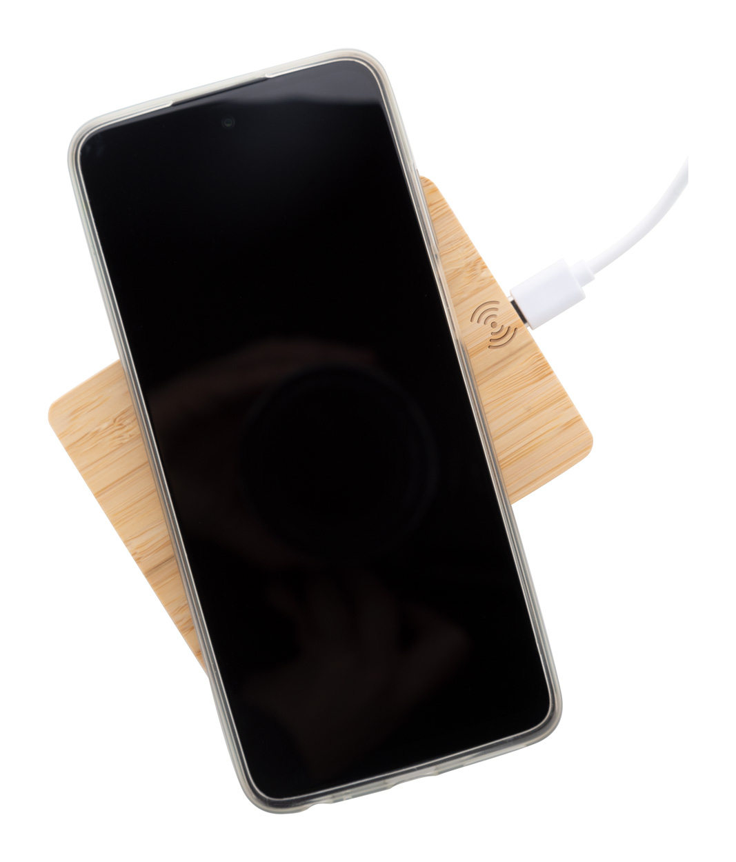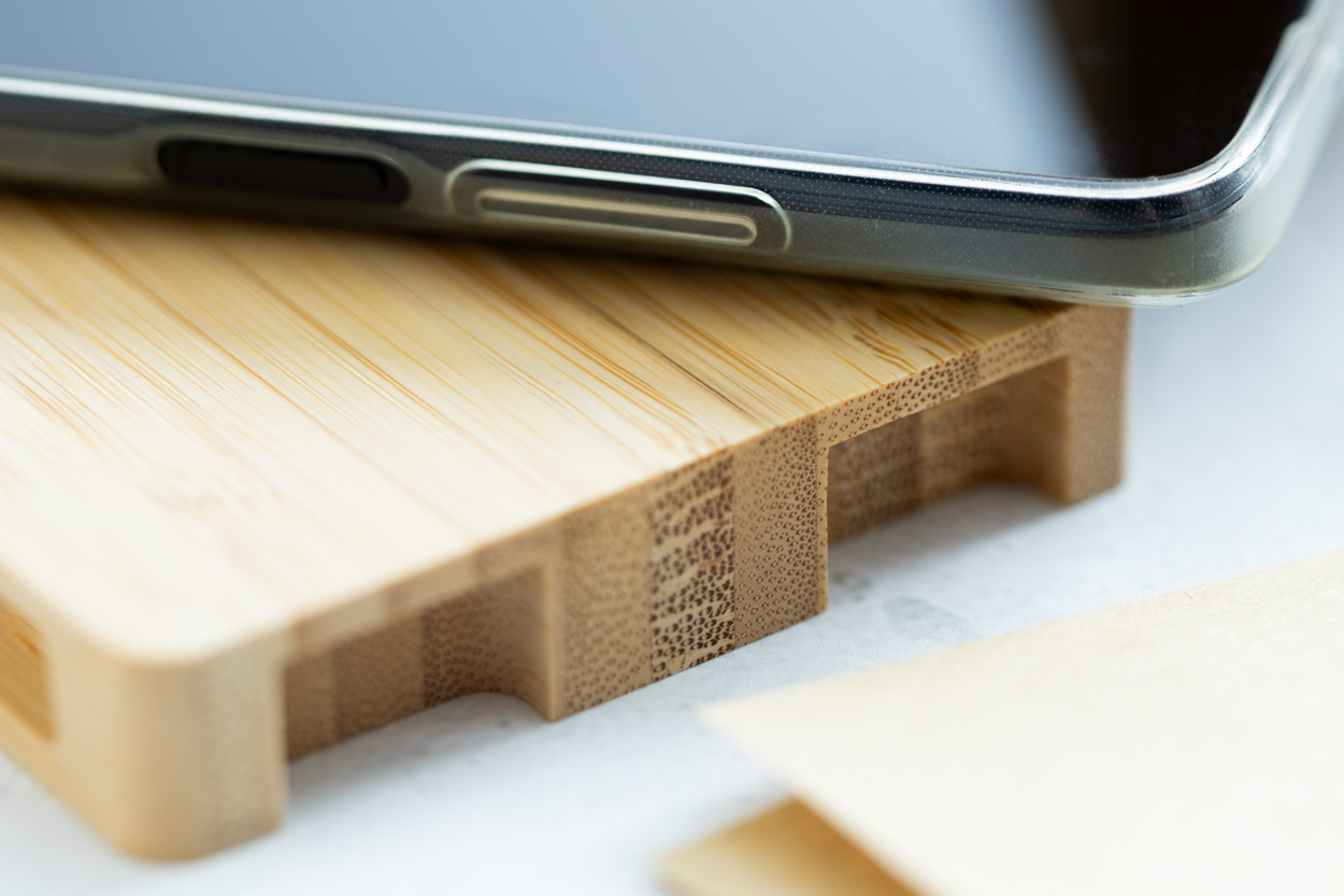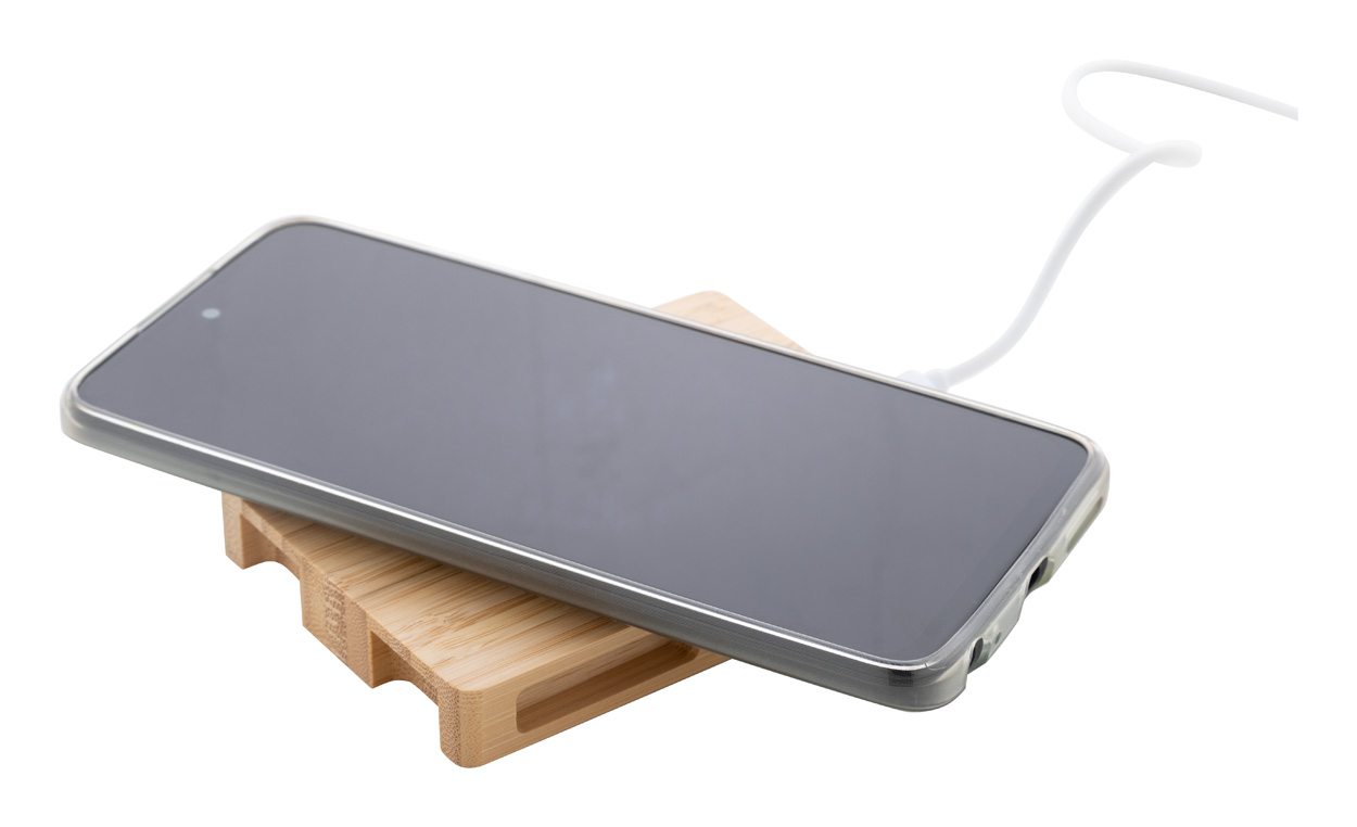 Wireless-Fast-Charger (10 W) im palettenförmigen Bambusgehäuse. Inklusive USB-Ladekabel.