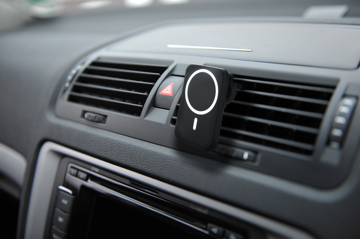 Magnetische Auto-Handyhalterung aus recyceltem ABS-Gehäuse mit integriertem Wireless-Charger (15 W) und verstellbarer Lüftungshalterung. Inklusive selbstklebendem Metallring zur Nutzung der Magnetfunktion auf allen Wireless-Chargern. Kompatibel mit iPhone® 12 oder neuer. Inkl. USB-Ladekabel.