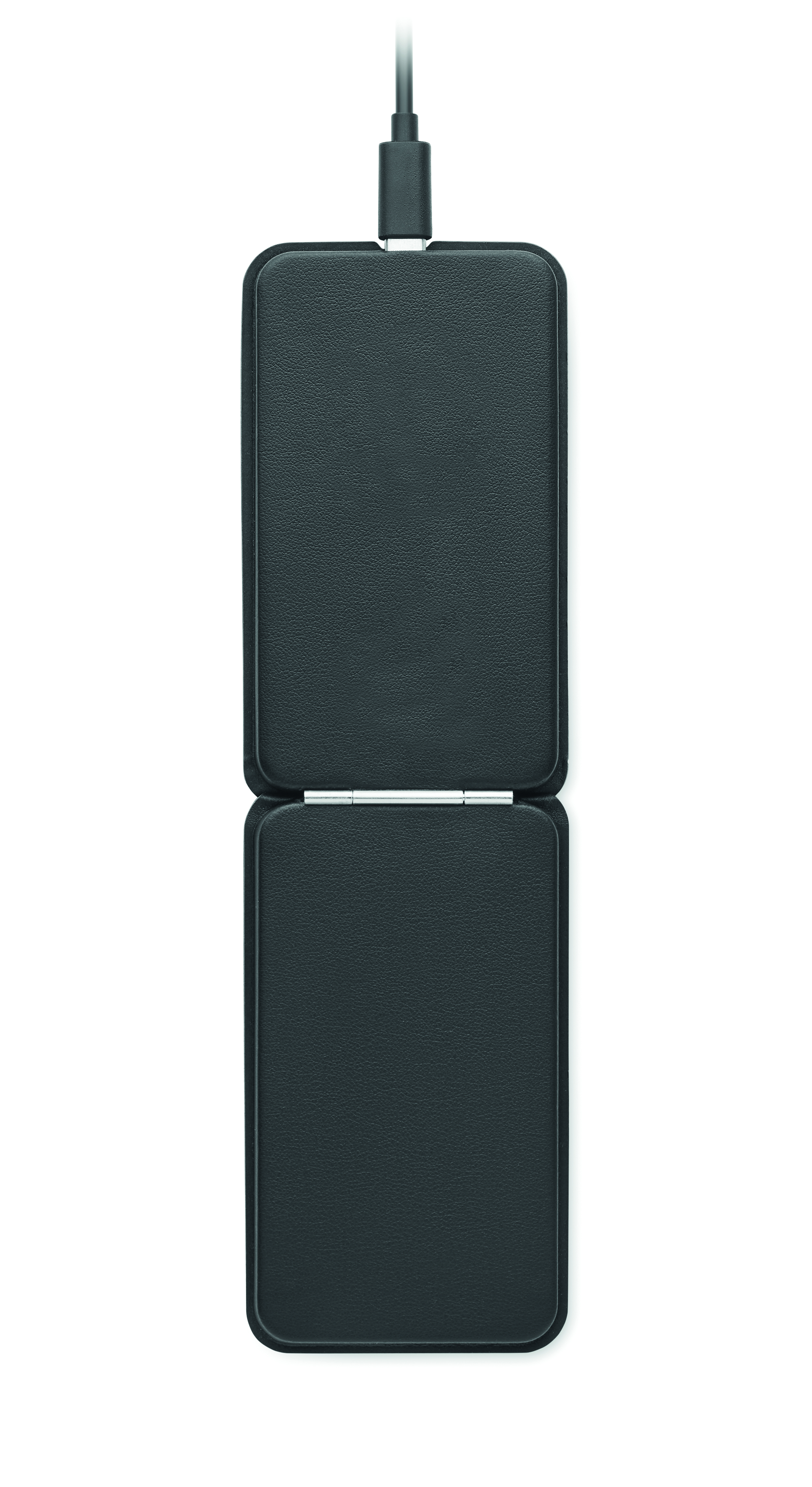 Klappbares kabelloses Ladegerät 15W mit magnetischem Smartphone-Halter. Recycelter Polyester (58%) und PU (42%).