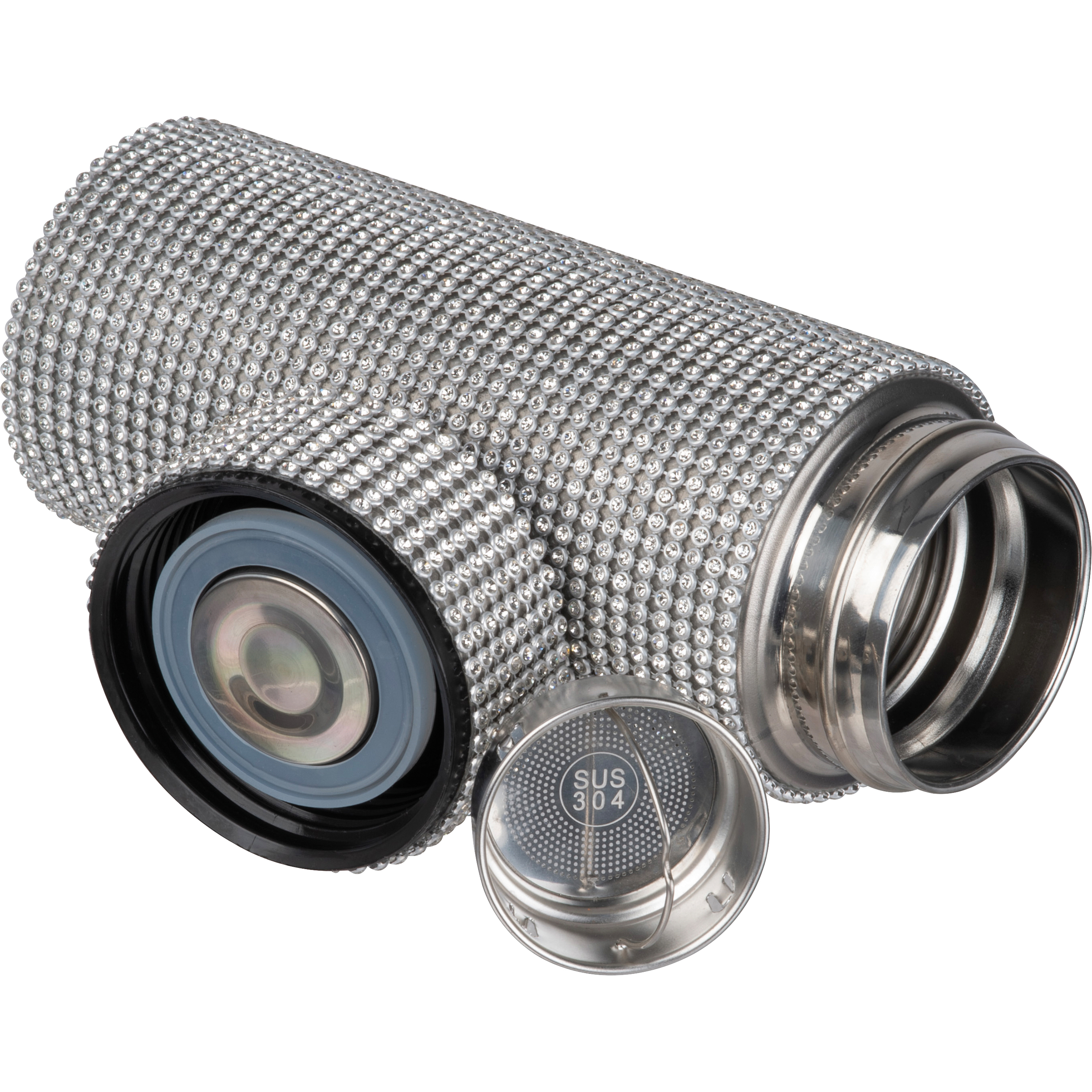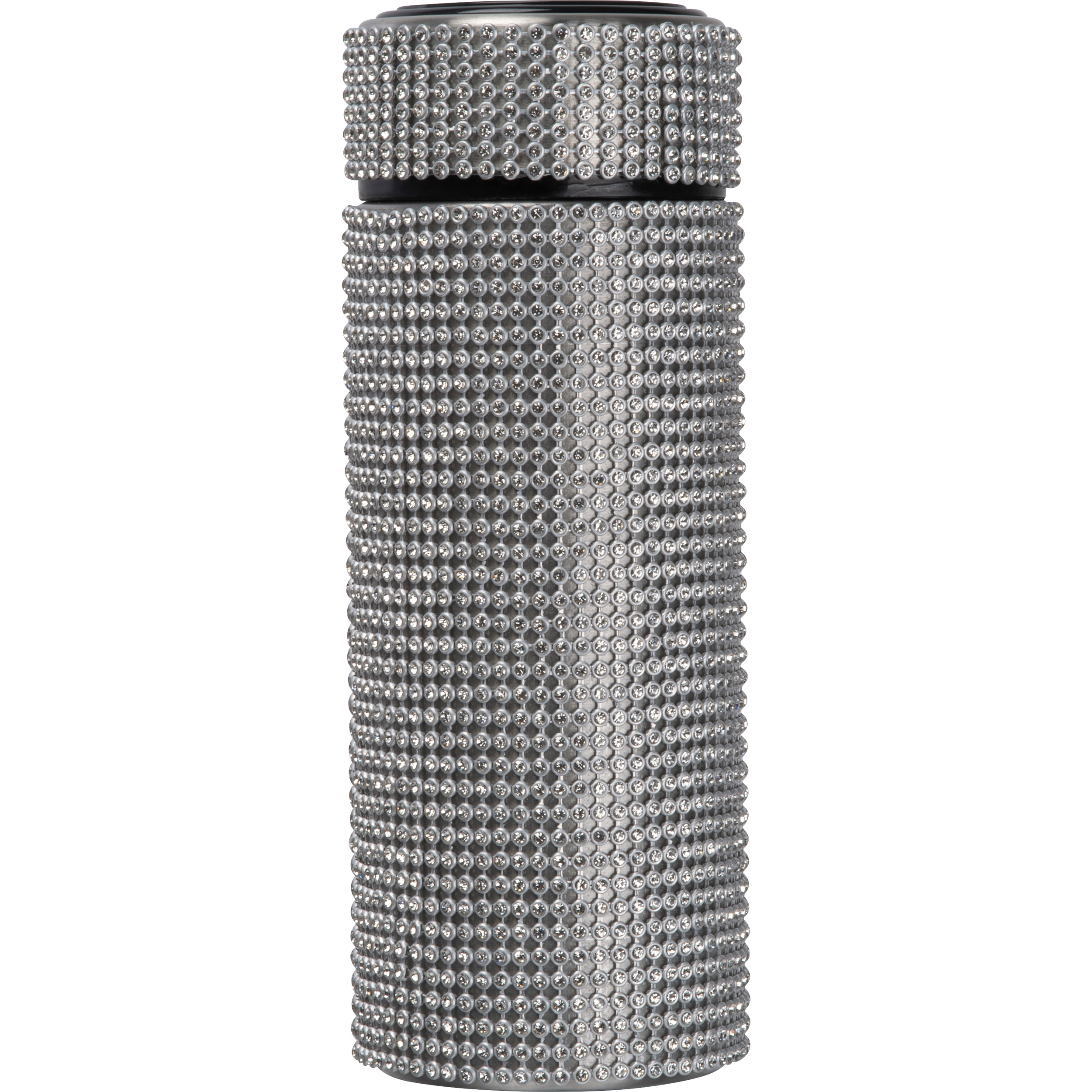 Doppelwandige Vakkum Trinkflasche aus Edelstahl mit funkelnden Strassstein-Akzenten, einem Füllvermögen von 350ml, Siebeinsatz und einem auslaufsicheren Drehverschluss. Ihre Werbung drucken wir auf den Deckel.