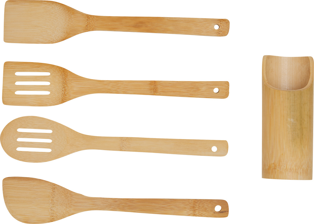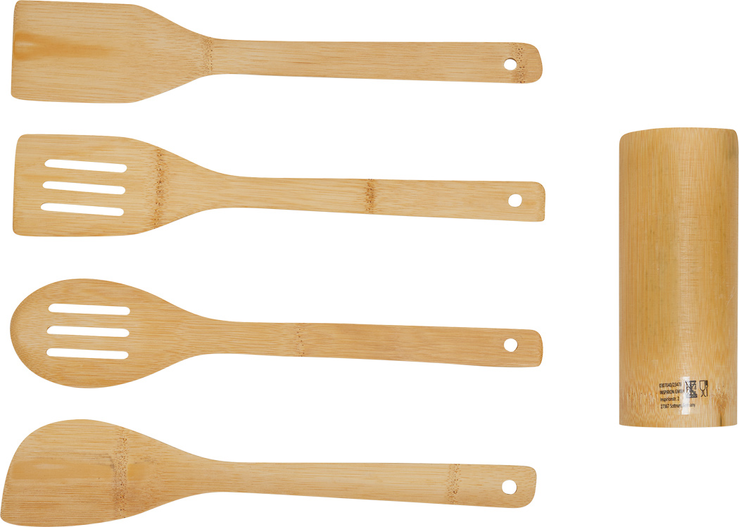 Küchenhelfer-Set COOKING TIME, 5-teilig: aus Bambus mit Halter, Kochlöffeln und Pfannenwender