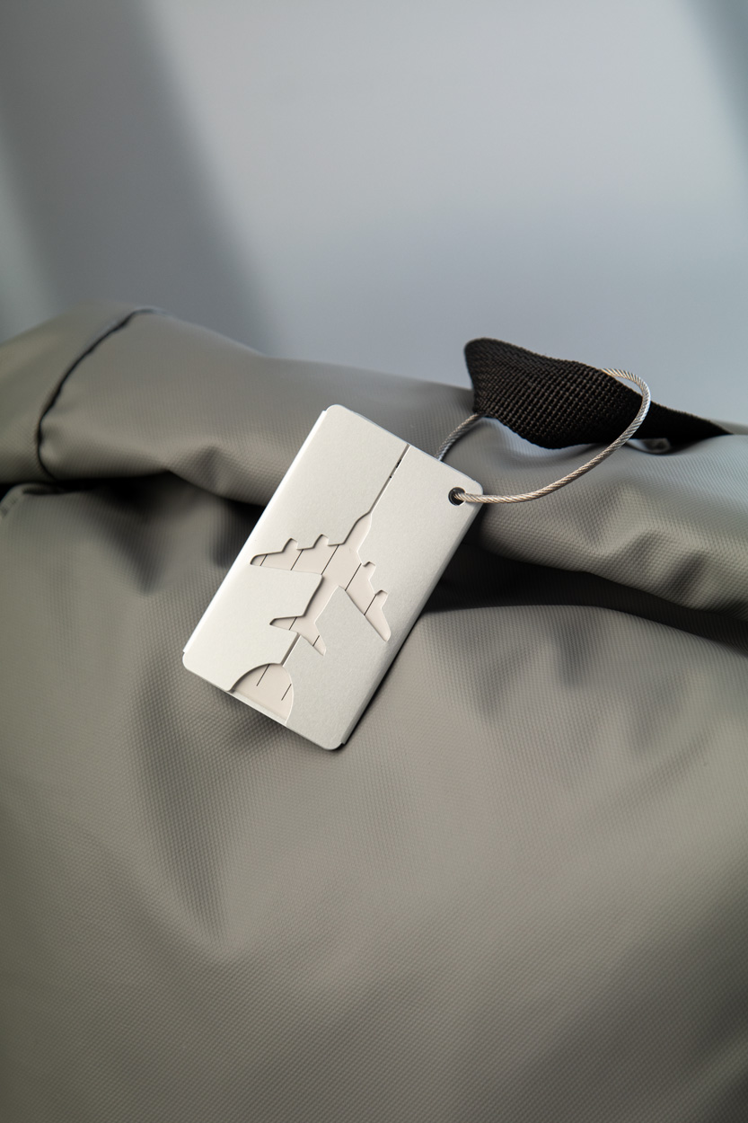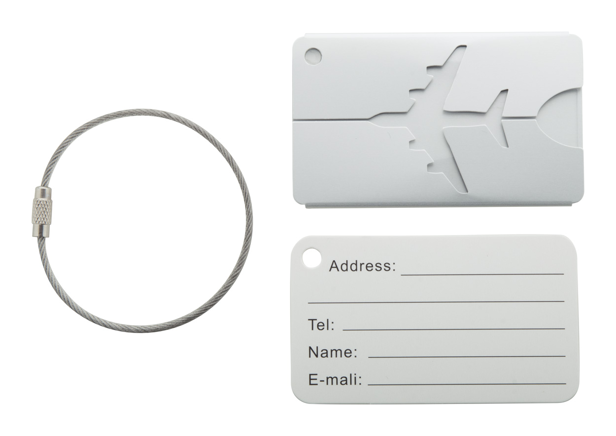 Kofferanhänger mit Flugzeugmotiv aus Aluminium und Schnur aus Metall.