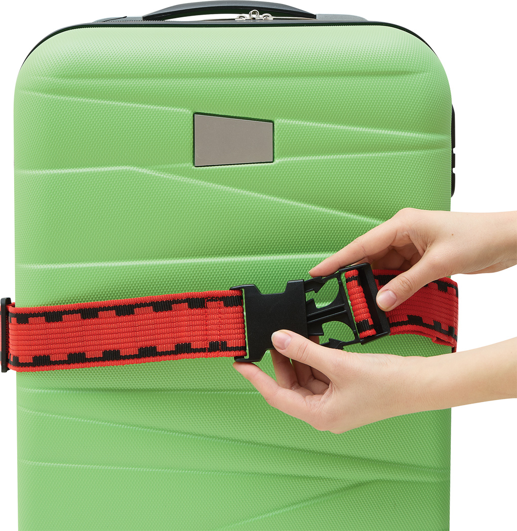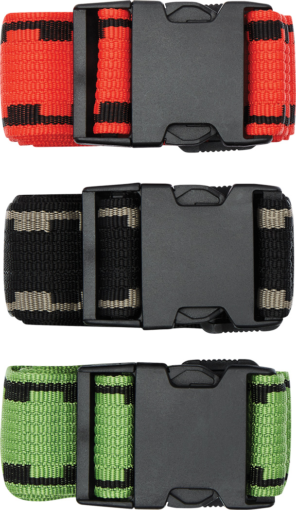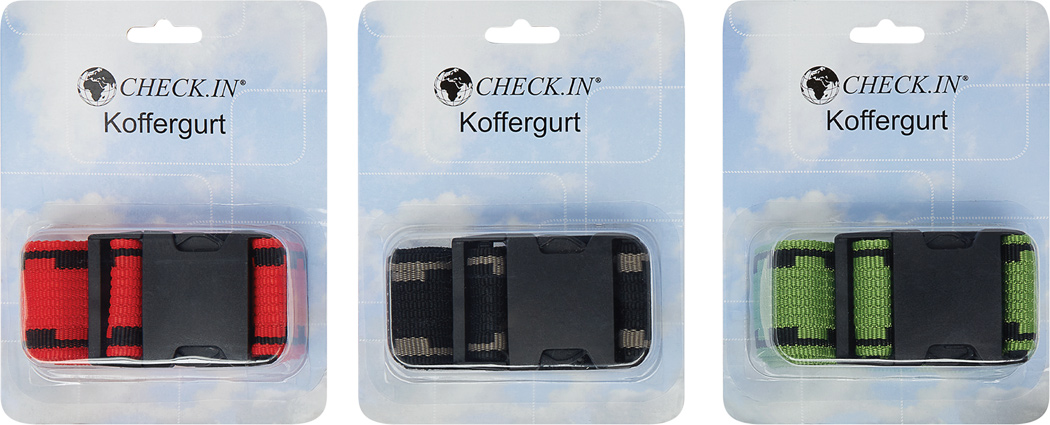 Koffergurt FIX: mit leichtgängigem Schnappverschluss, zur Sicherung und besseren Wiedererkennung des Reisegepäcks, in Blisterverpackung, 3-Farben sortiert