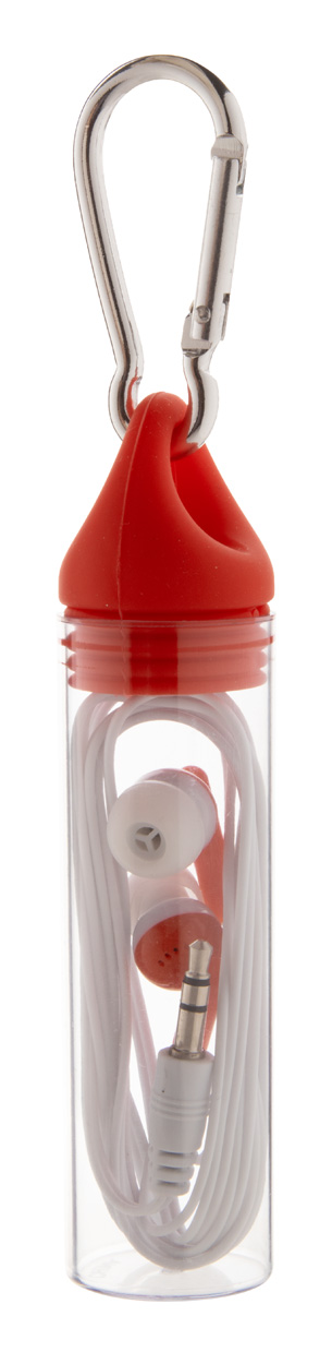 In-Ear-Kopfhörer mit 3,5 mm Audio-Stecker in Kunststoffbehälter mit Karabiner und farblich abgestimmten Deckel.