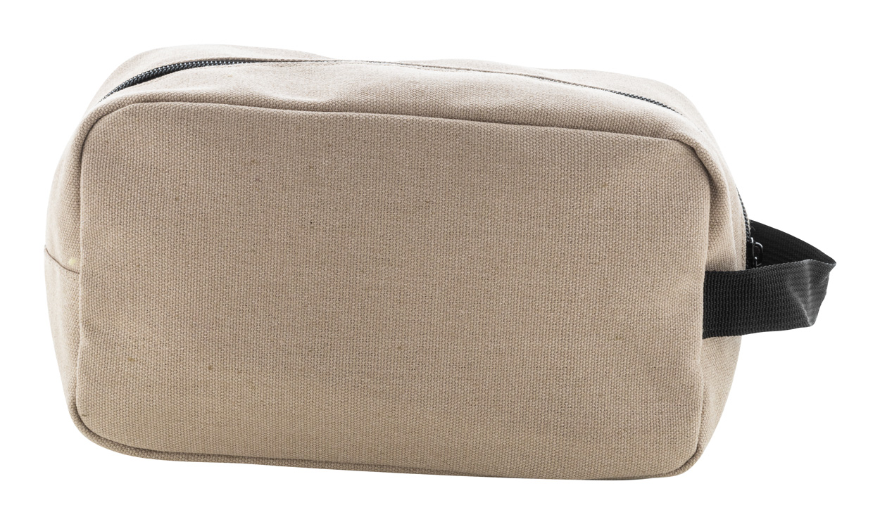 Kosmetiktasche aus recyceltem Canvas mit zwei Reißverschlußfächern und Tragegriff. Material: 70% recycelte Baumwolle und 30% RPET-Polyester. Mit Label recycelte Baumwolle.