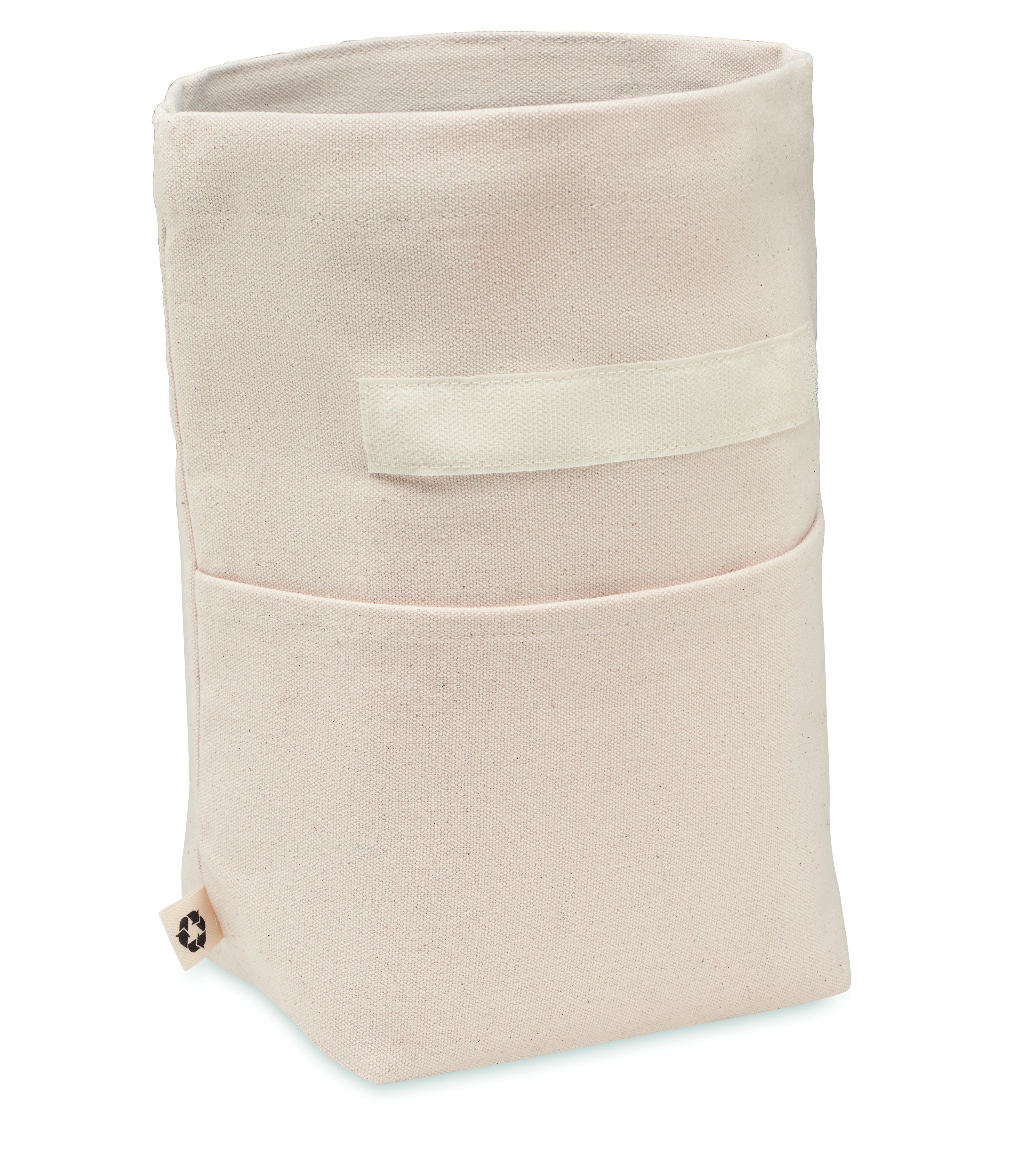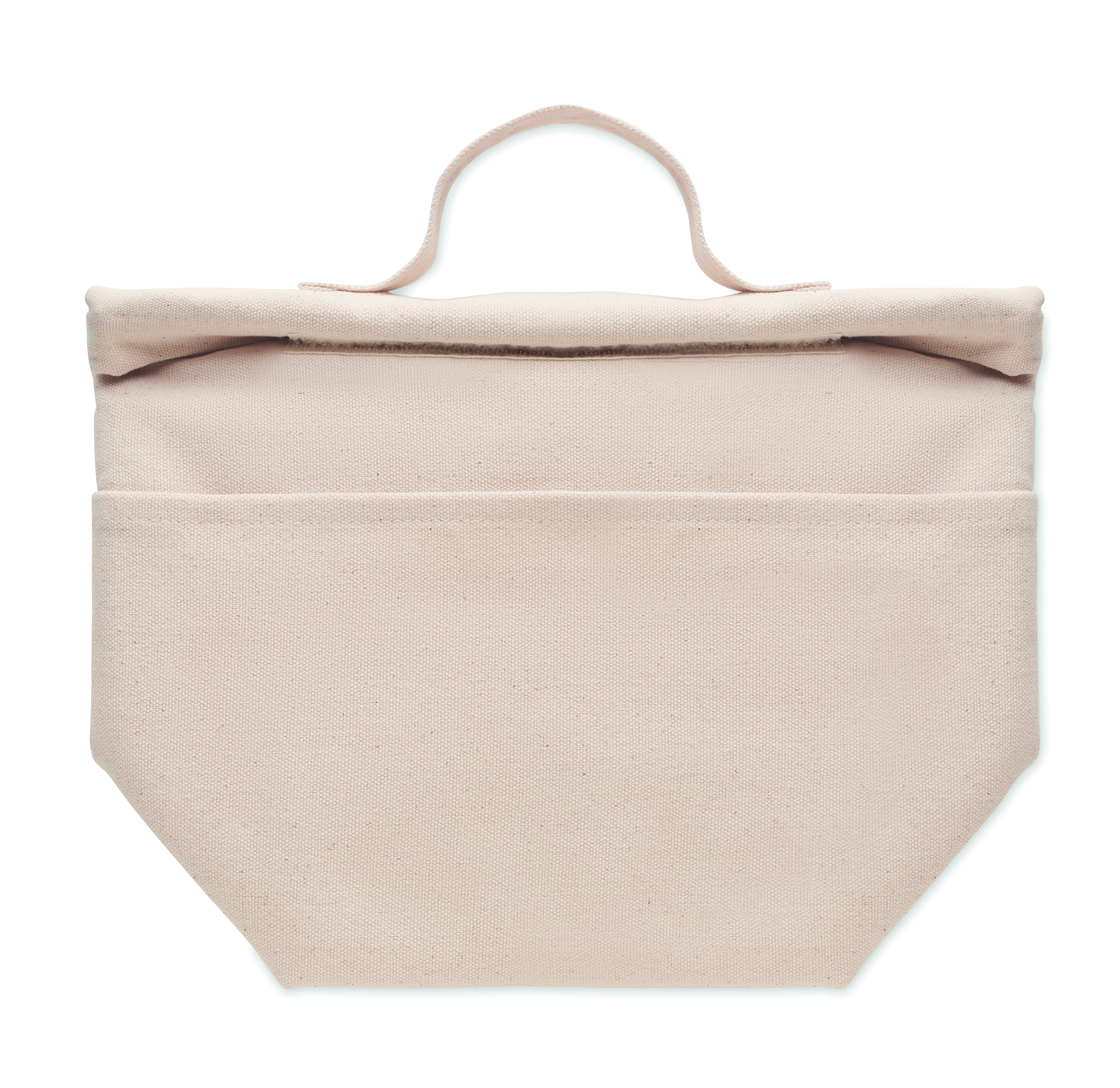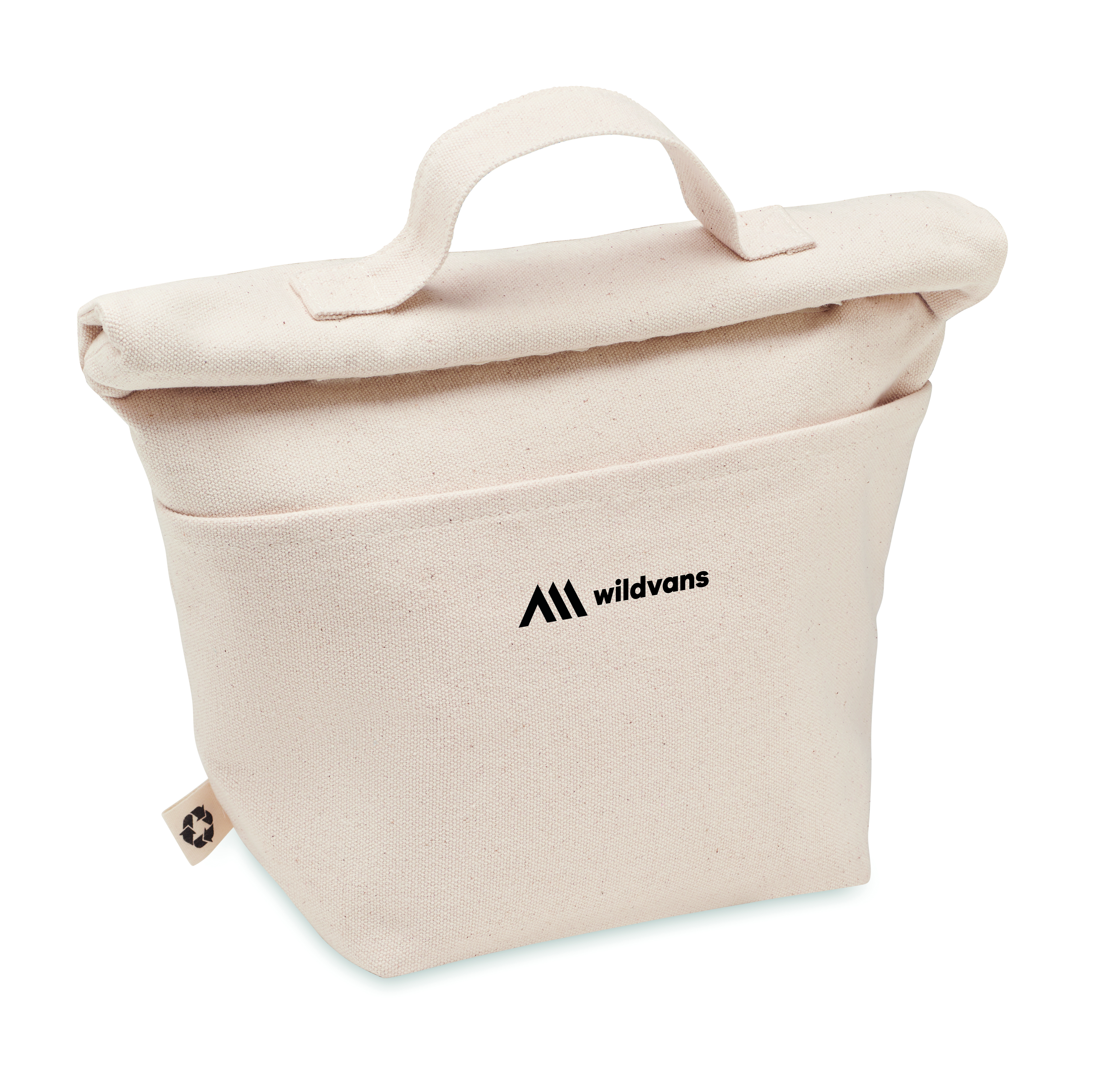 Kühltasche aus aus recyceltem Polycotton (70% recycelte Baumwolle, 30% recycelter Polyester) mit Rolltop-Klettverschluss. Isolierung: 3mm PE-Schaum mit 12C PEVA.