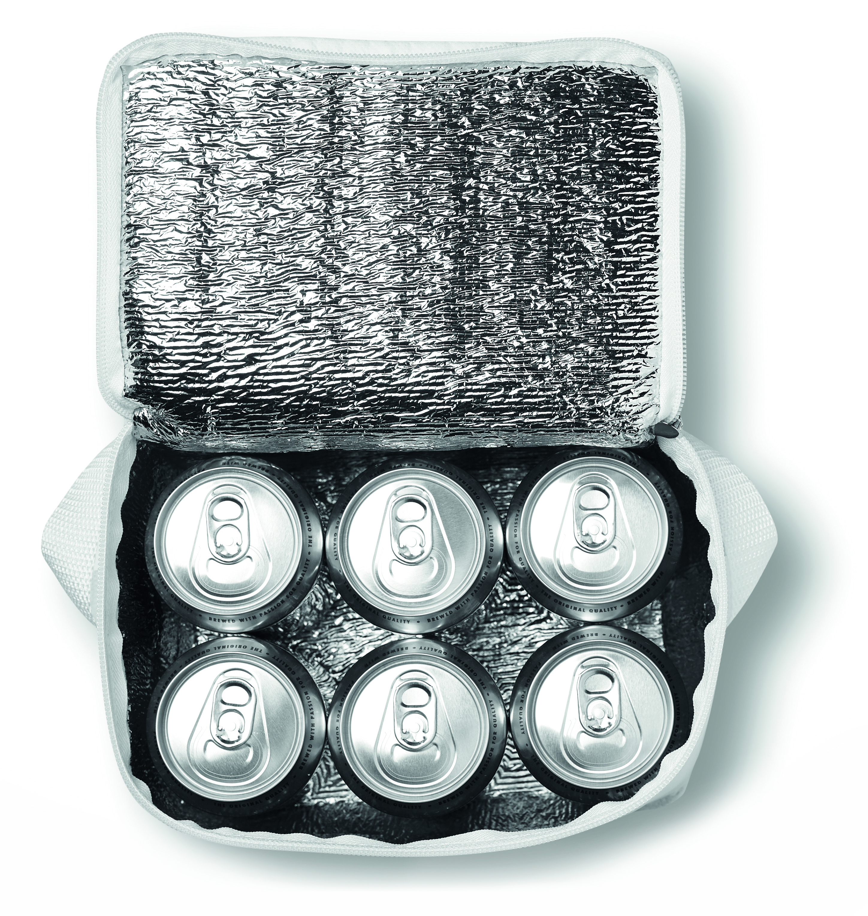 Kühltasche für 6 Dosen. Außenseite 200D Polyester. Mit weißen Absetzungen Non-Woven 80 g / m². Isoliermaterial: Mit Aluminiumfolie laminierter Schaumstoff. Füllmenge 3L.
