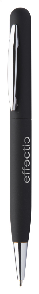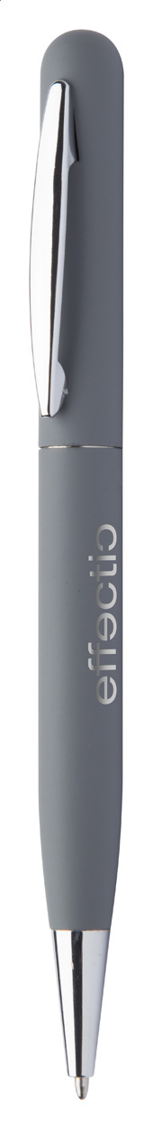 Drehkugelschreiber aus Metall mit gummierter Oberfläche und Spezialbeschichtung für eine Spiegelgravur, blauschreibend.