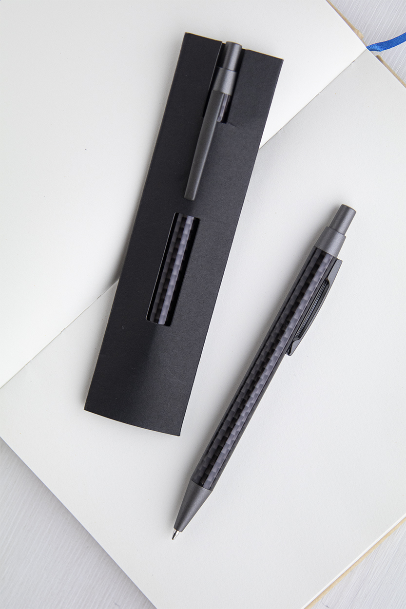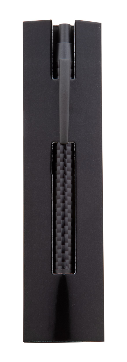 Metall-Kugelschreiber mit Gehäuse in Carbonoptik, blauschreibend, in schwarzem Pappetui.