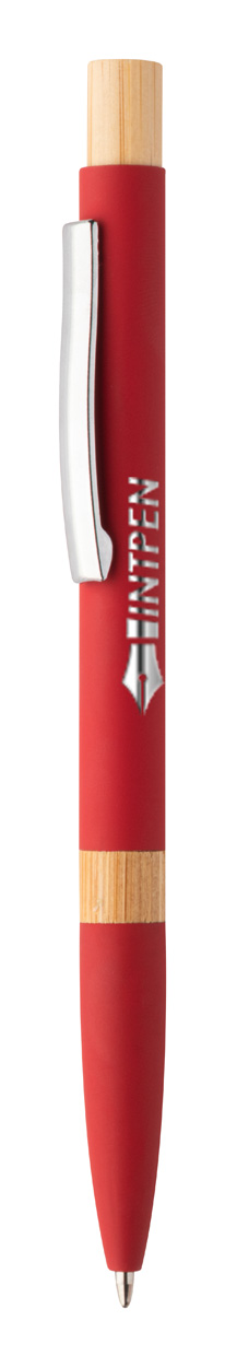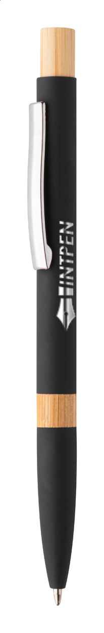 Kugelschreiber aus recyceltem Aluminium mit Bambus-Elementen, gummierter Oberfläche und verchromten Clip. Mit Spezialbeschichtung für Spiegelgravuren. Blauschreibend.