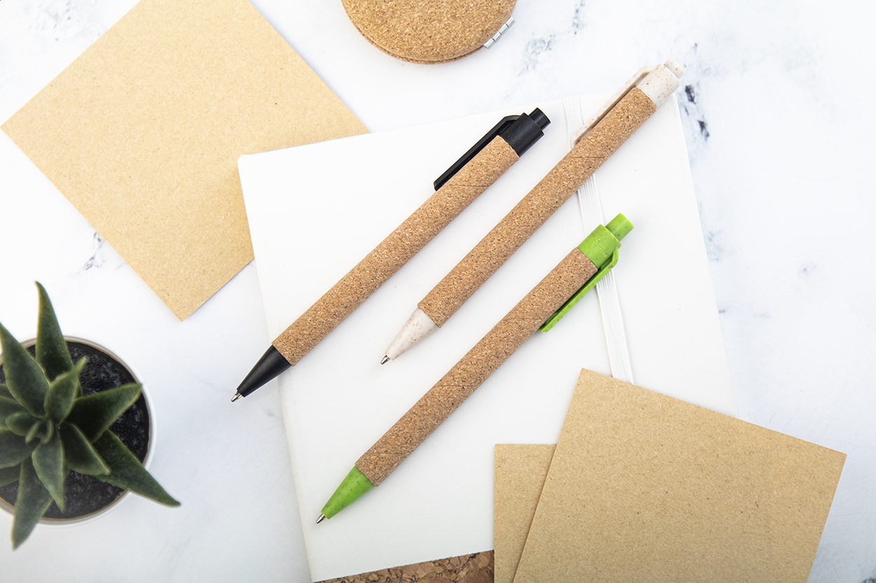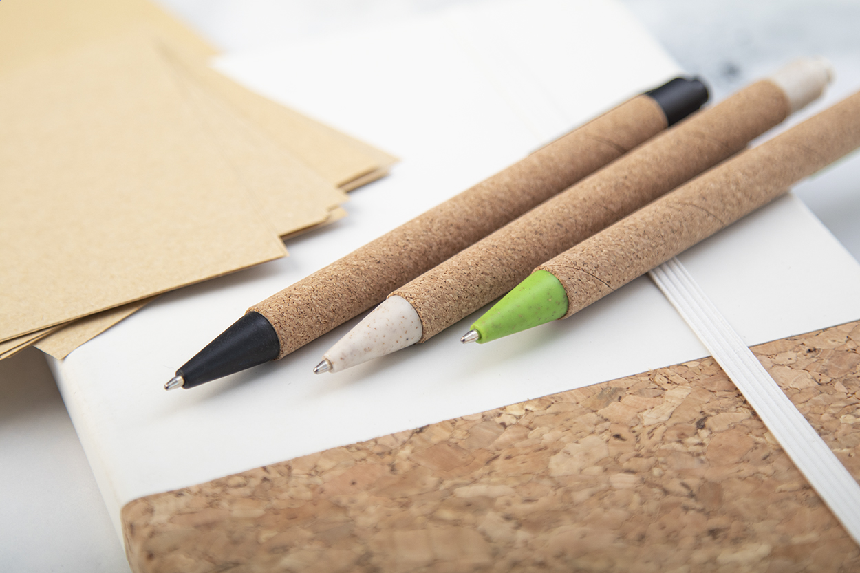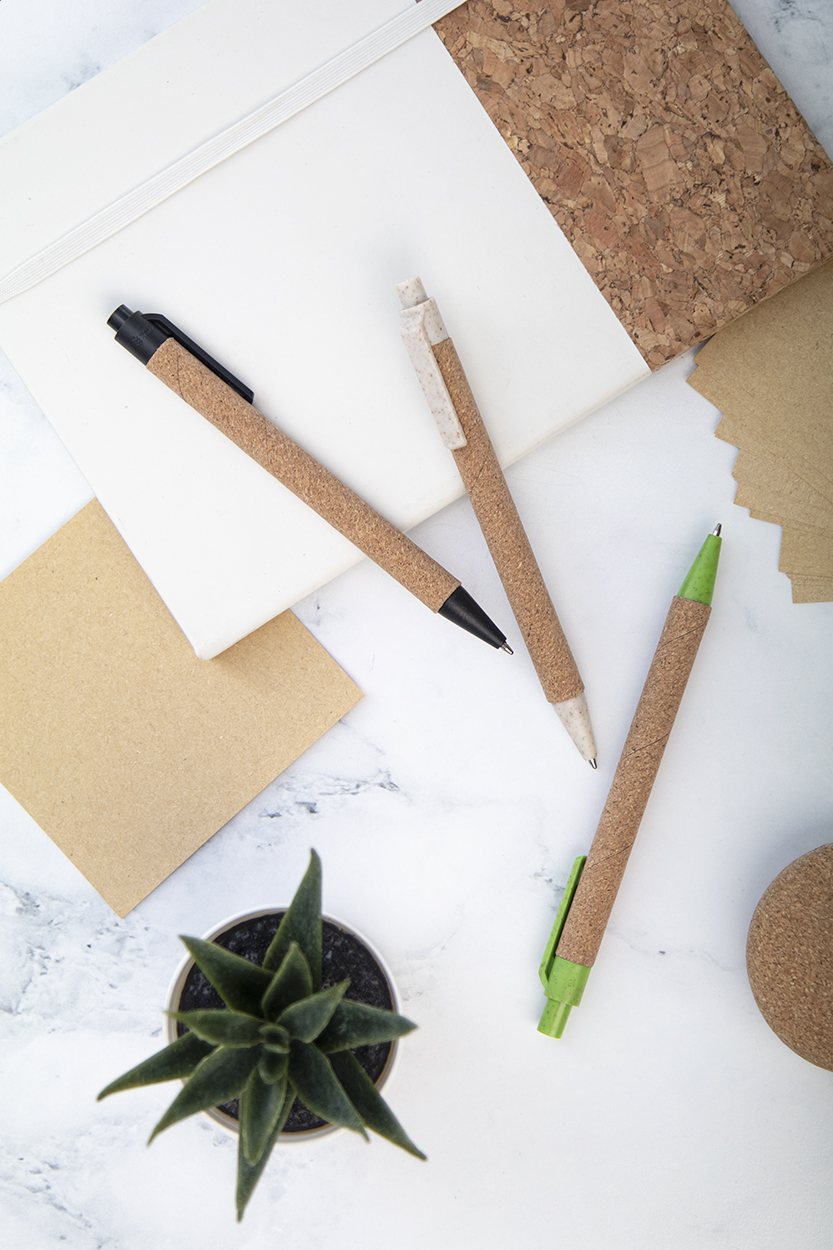Ökologischer Kugelschreiber aus Weizenstroh-Kunststoff, Oberfläche Korpus Naturkork, blauschreibend.
