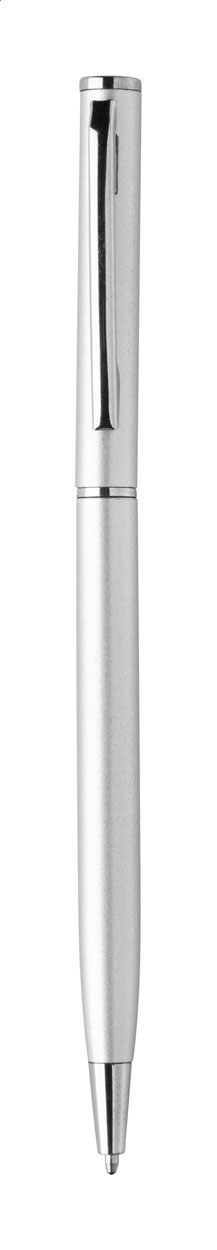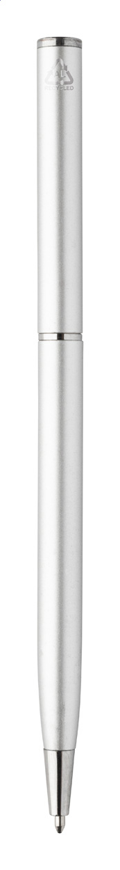 Drehkugelschreiber aus recyceltem Aluminium mit verchromten Elementen, blauschreibend.