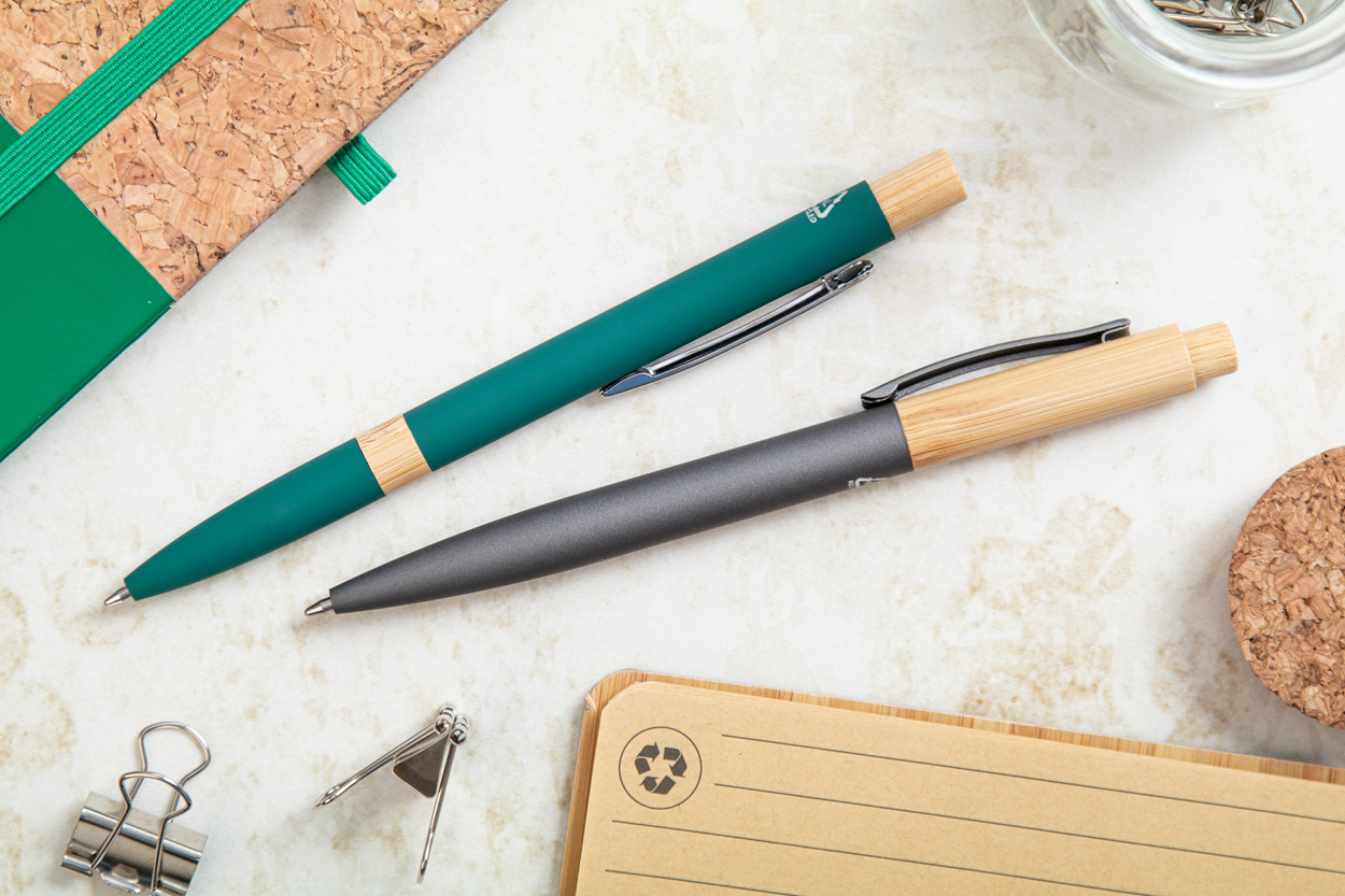 Kugelschreiber aus Bamgus und recyceltem Aluminium mit gummierter Oberfläche und Gunmetal-Clip. Blauschreibend.