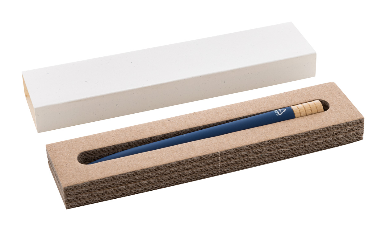 Drehkugelschreiber aus recyceltem Aluminium mit Gunmetall-Oberfläche und Bambus Drücker, blauschreibend. Einzeln in Kraftpapierbox.
