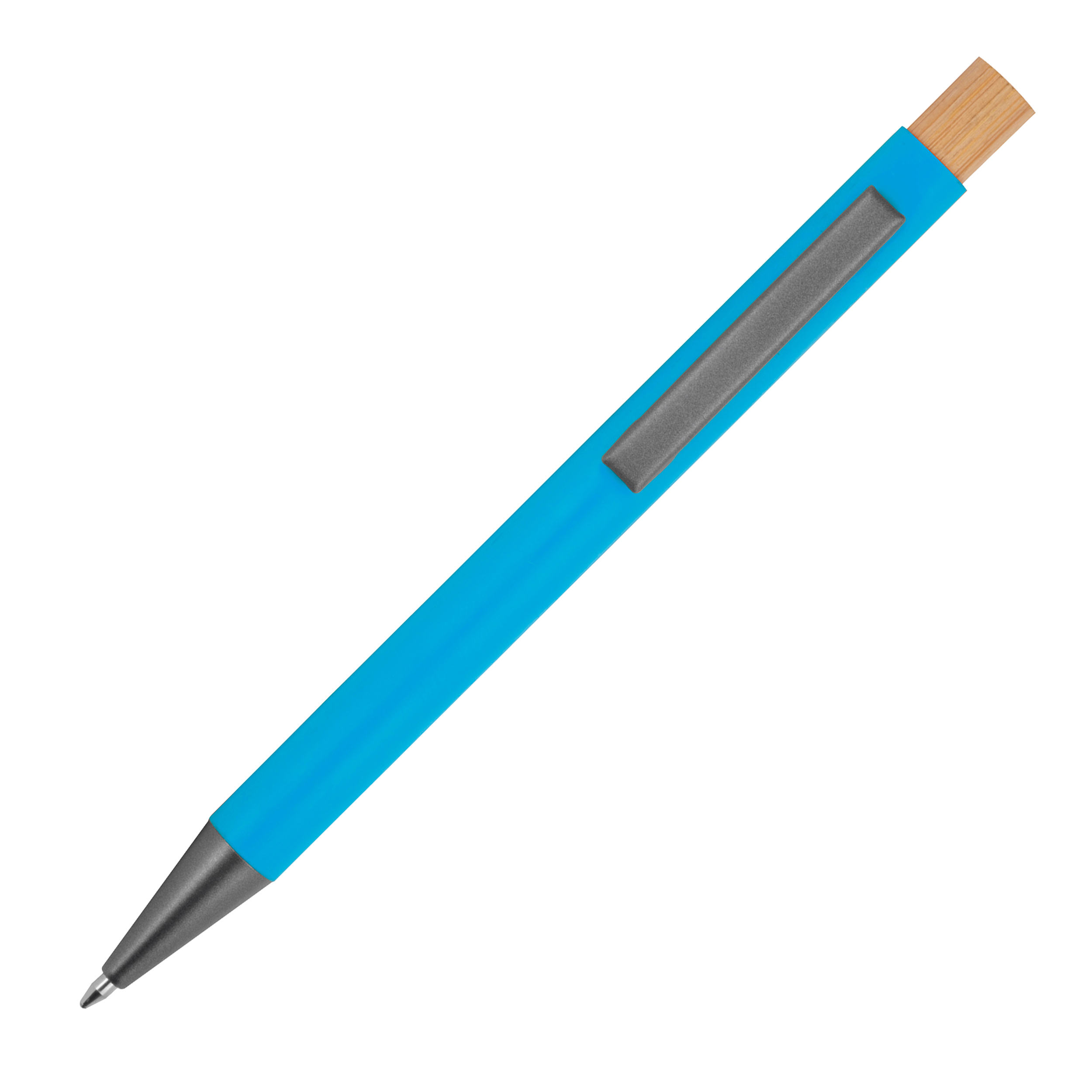 Kugelschreiber aus recyceltem Aluminium mit Bambusdrücker, Metallclip und blau schreibender Großraummine. Ihre Werbung wird rechts vom Clip graviert.