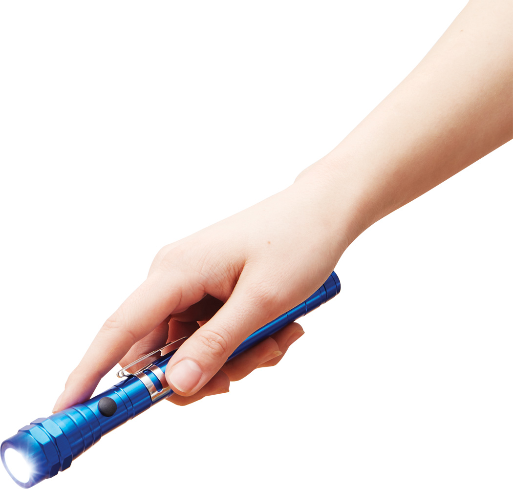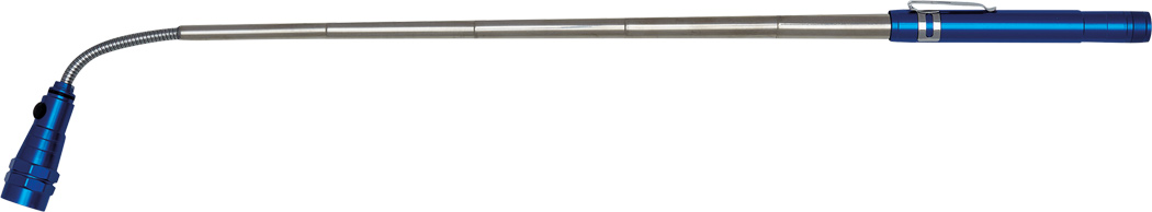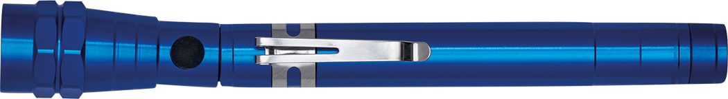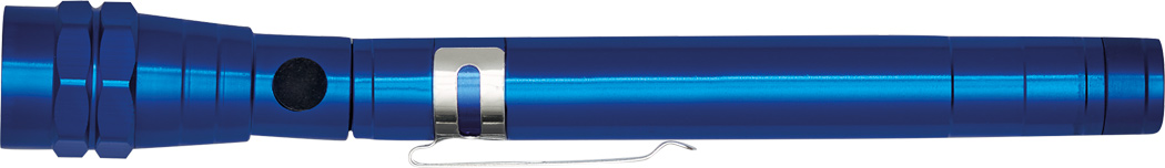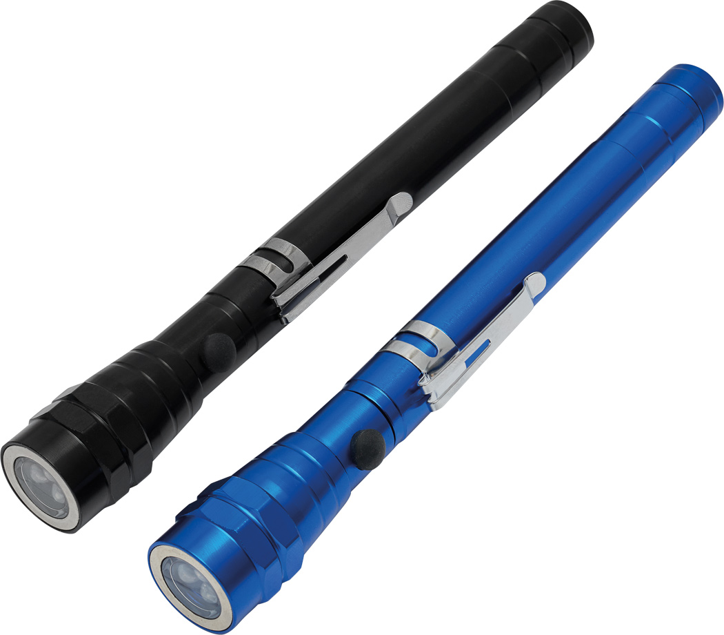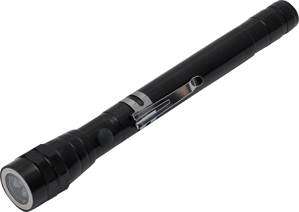 LED-Taschenlampe REFLECT: 3 lichtstarke weiße LED, gummierter An- und Ausschalter, mit bis auf ca. 55 cm ausziehbares Teleskopsystem, schwenkbarer Lampenkopf, Magnetring, praktischer Befestigungsclip, Gehäuse aus Aluminium, batteriebetrieben (4x LR44 Knopfzellen enthalten), in Box