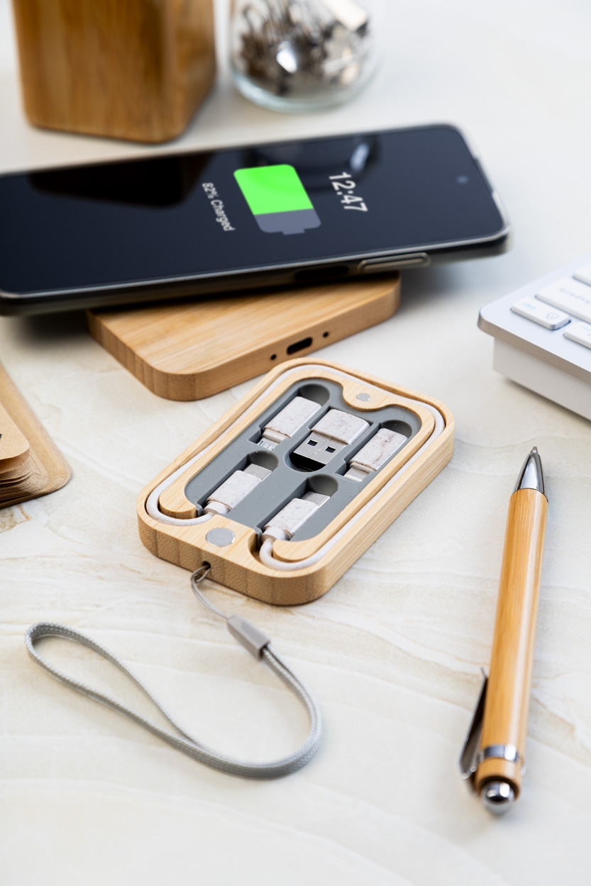 USB-Ladekabelset und Wireless-Fast-Charger (15W) aus ökologischem Weizenstroh-Kunststoff in magnetischem Bambusetui mit Trageschlaufe. Inkl. USB-C-Kabel mit USB-, Micro-USB- und Lightning-Adapter.