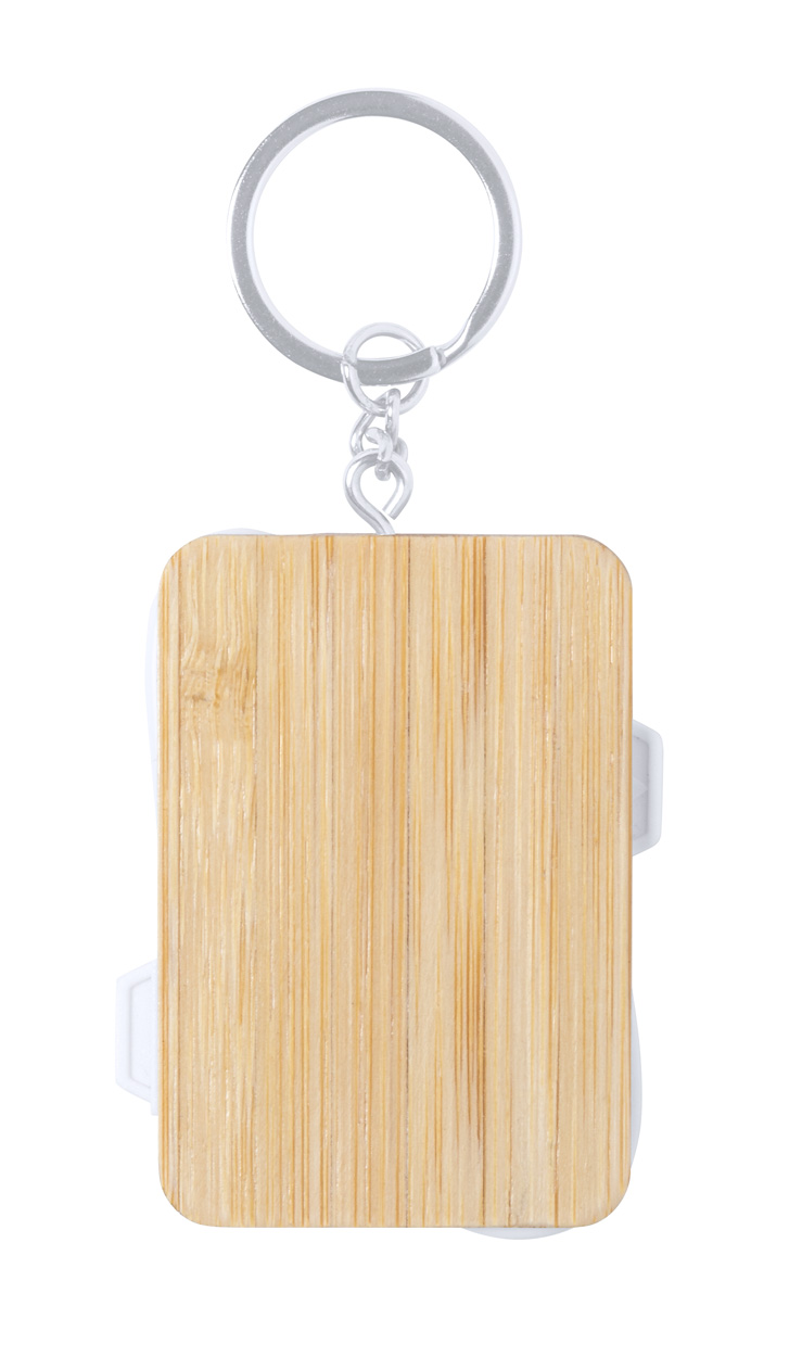 Ladekabel-Schlüsselanhänger aus Bambus mit Micro-USB-, USB-C- und Lightning-Anschlüssen. Mit USB- und USB-C Eingängen.