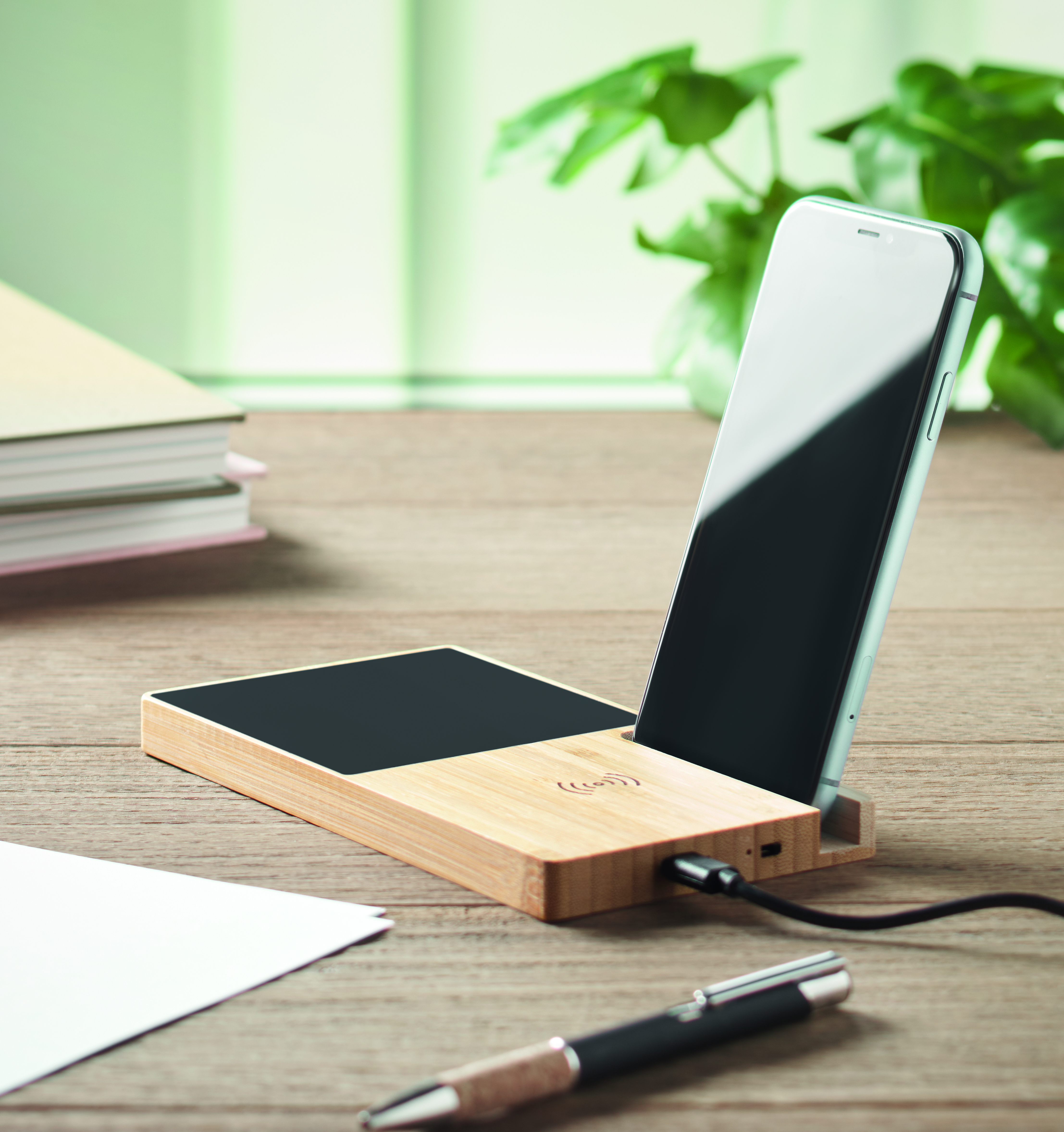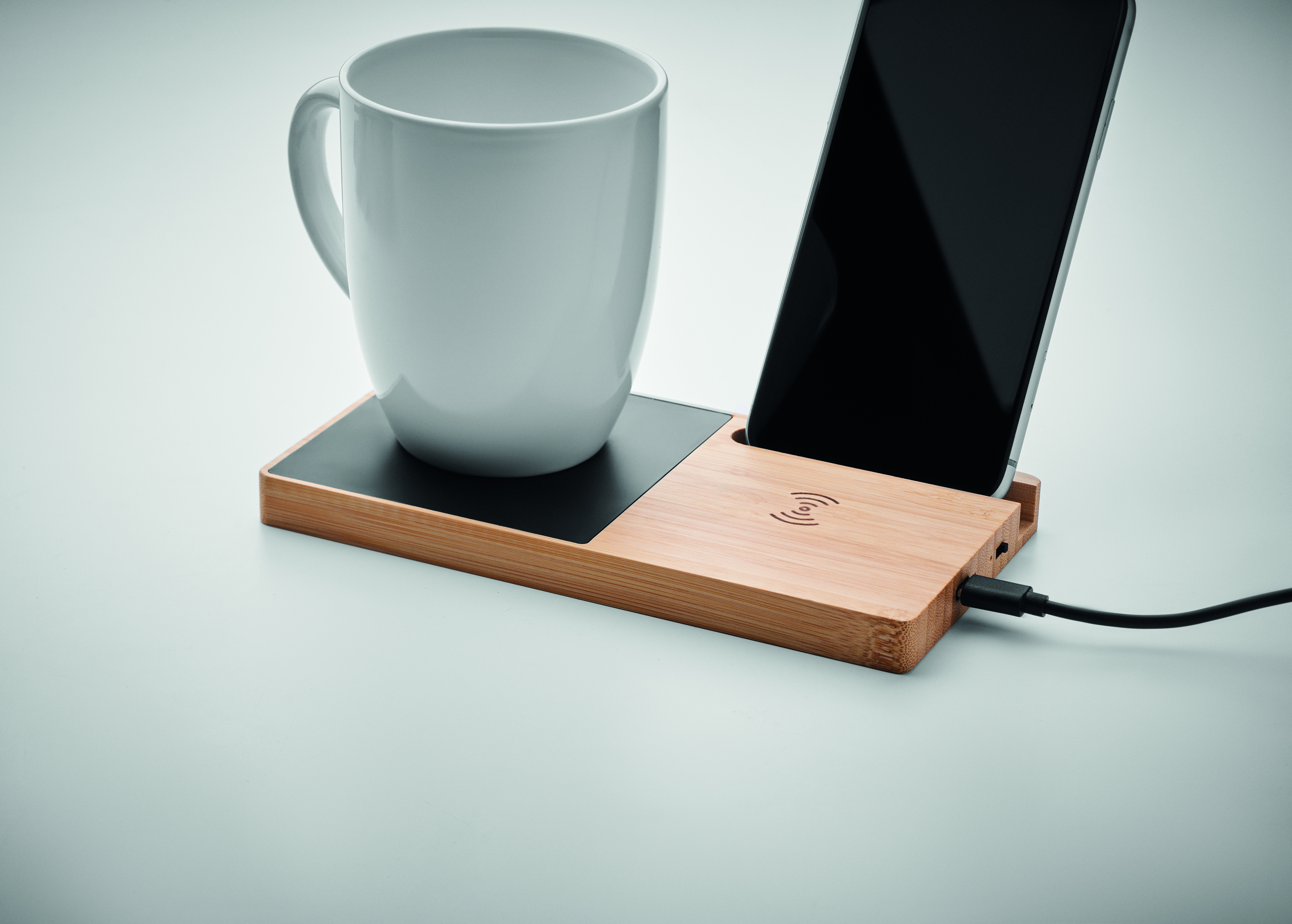Kabellose Ladestation mit Tassenwärmer und Smartphone-Halter. Bambus. Verbinden Sie das Gerät mit dem Computer und laden Sie Ihr Smartphone durch einfaches Auflegen auf. Ausgang: DC 9V/1.67A (15W). Kompatibel mit allen QI-fähigen Geräten wie den neuesten Android Smartphones, iPhone® 8 und X und höher.