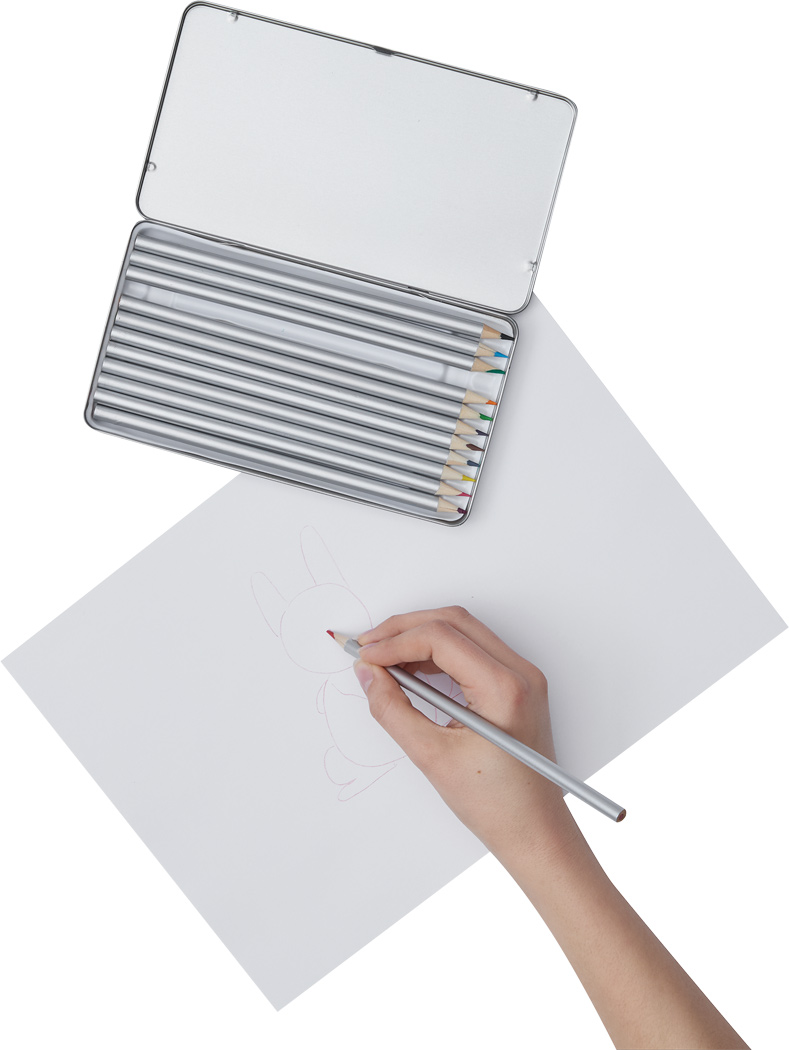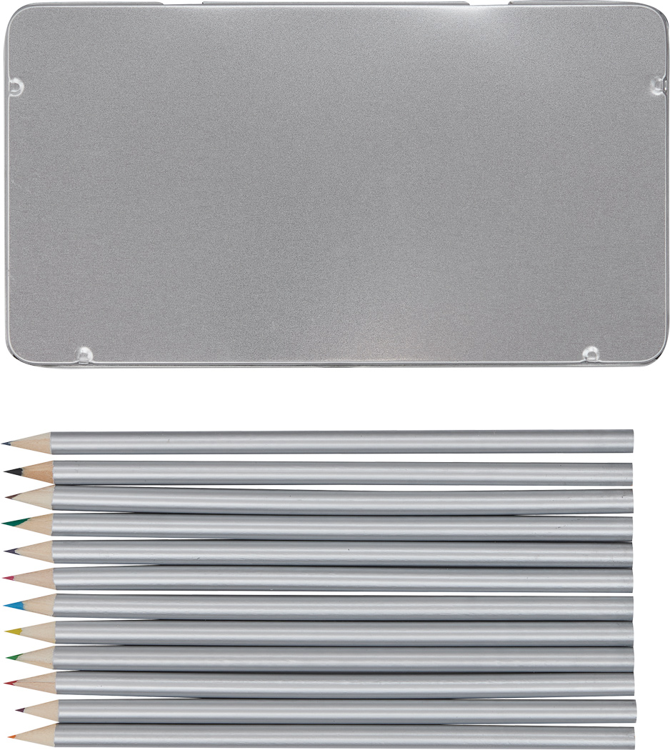 Lange Buntstifte SILVERSTAR: 12 Stück, verschiedenfarbig, silber lackiert, angespitzt, in Metallbox