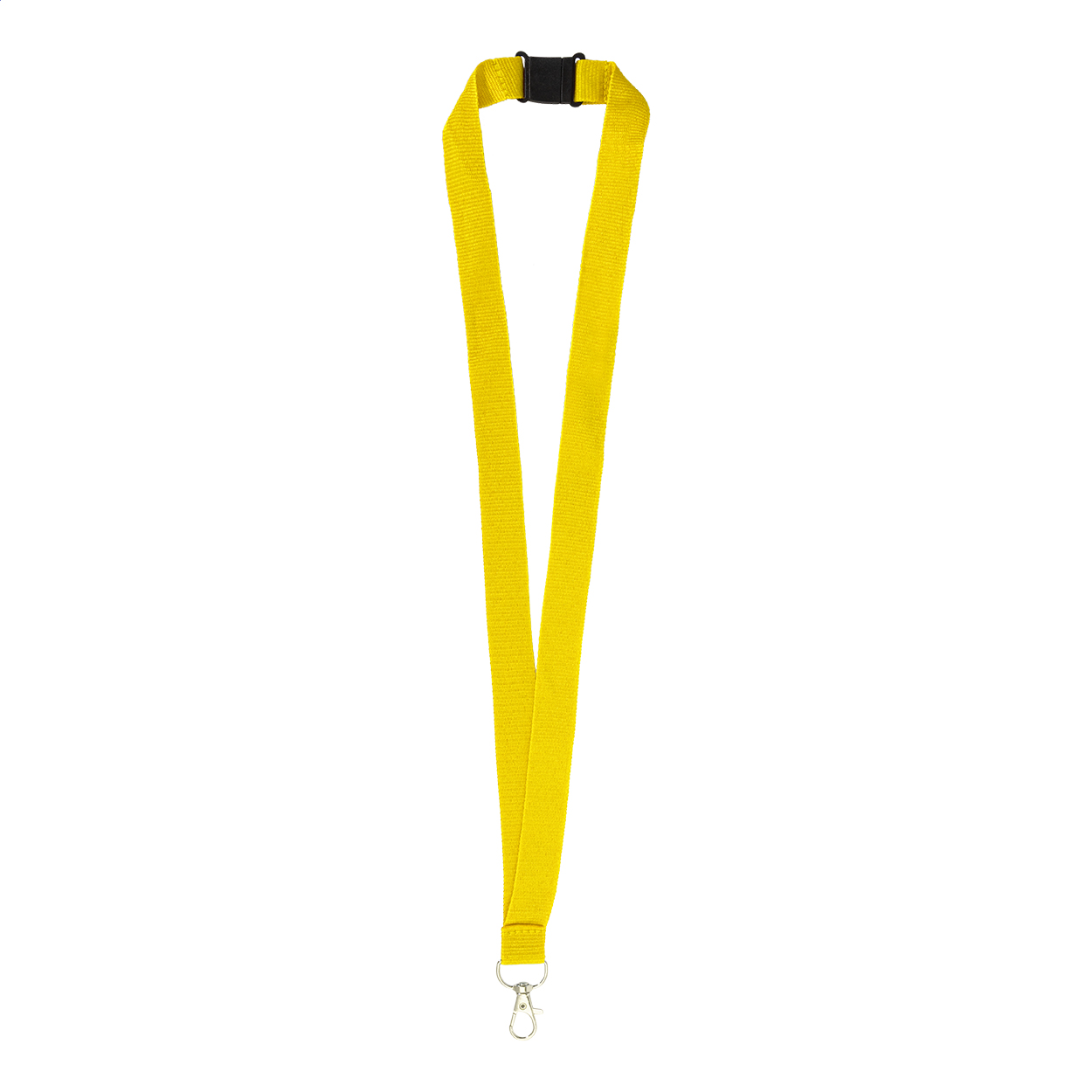 Polyester-Lanyard mit Metallkarabiner und Sicherheitsverschluss.