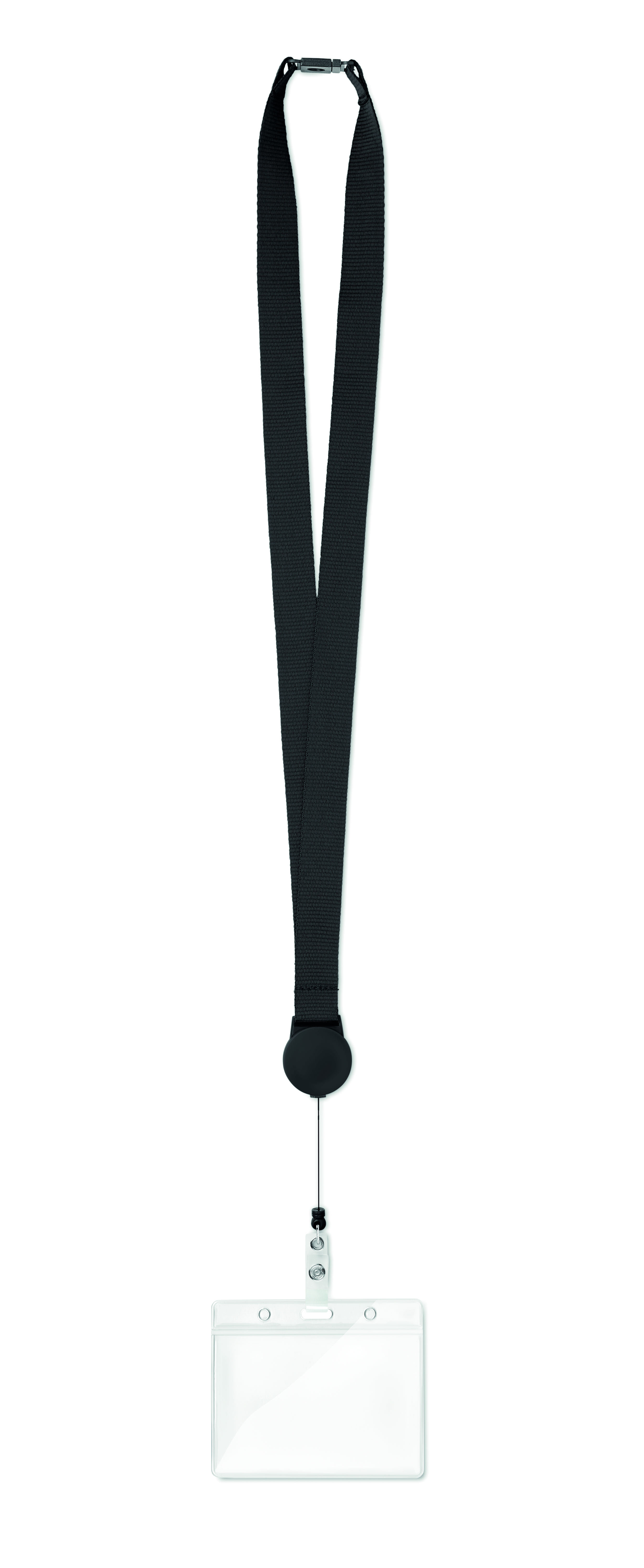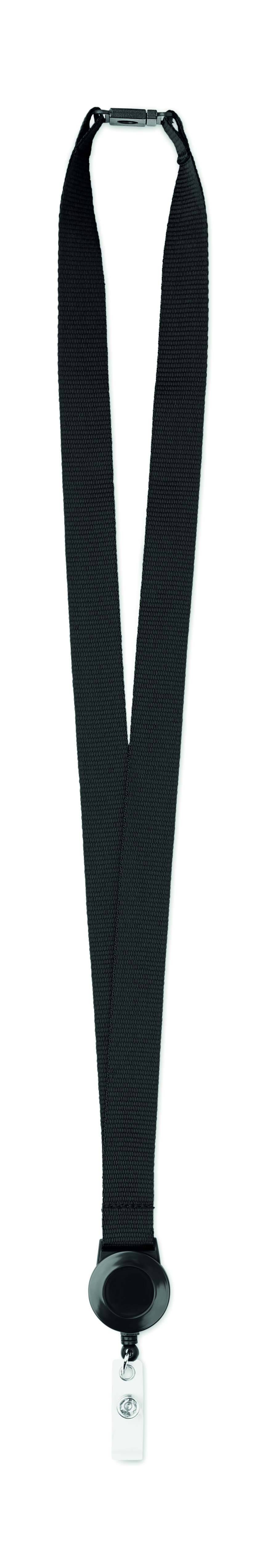 Lanyard aus 100% Polyester mit ausziehbarem Badge-Halter mit Druckknopf. Mit Panikverschluss.