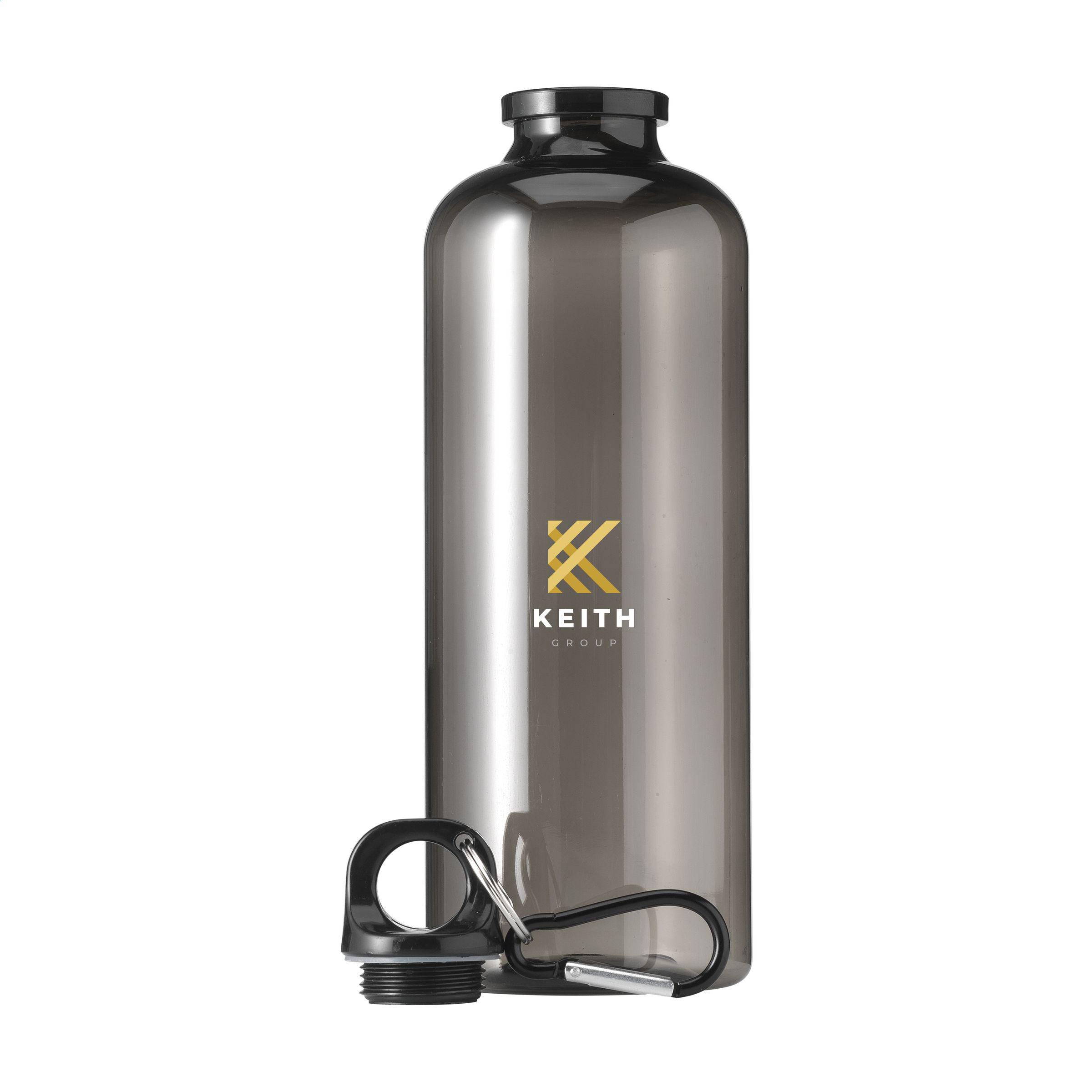 iederverwendbare, recycelte Wasserflasche. Die Flasche besteht zu 100% aus RPET. Mit Kunststoff-Schraubverschluss und einem Aluminium-Karabiner, mit dem Sie die Flasche einfach an Ihrer Tasche oder Ihrem Rucksack befestigen können. Der Karabiner ist nicht als Kletterwerkzeug geeignet. Sie können diese ideale, leichte Flasche überall hin mitnehmen. Auslaufsicher. Nur für kaltes Wasser geeignet. Nicht spülmaschinengeeignet. Gesamtes recyceltes Material: 83%. Fassungsvermögen 630 ml.