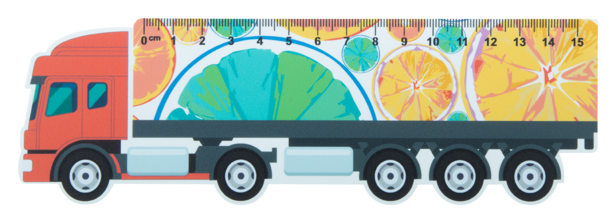 Flexibles Kunststofflineal (15 cm) im LKW-Design mit vollfarbiger Bedruckung. Der Preis ist inkl. UV-Druck auf einer Seite. Mindestmenge: 100 Stk.