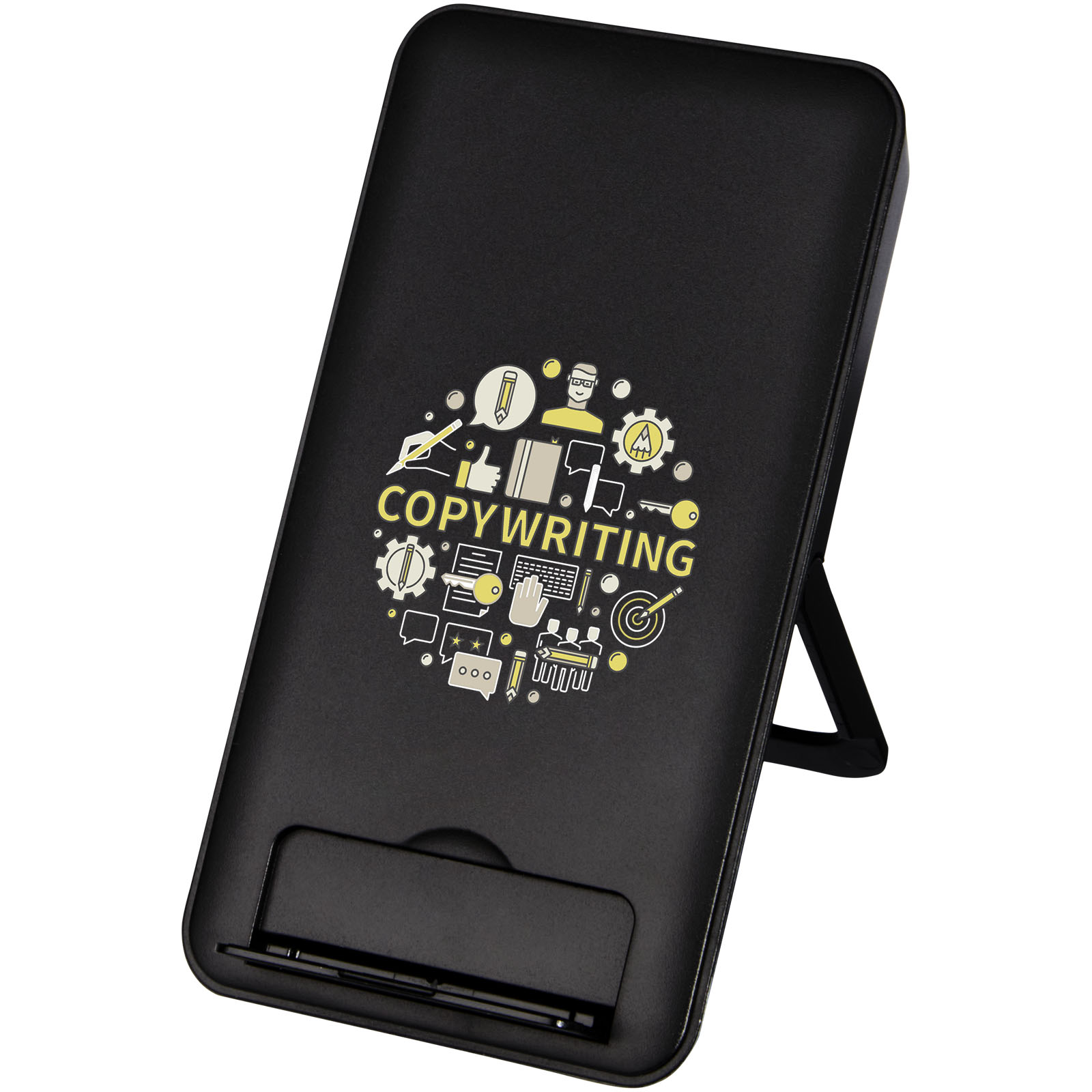 Kabelloses Ladepad aus recyceltem ABS Kunststoff. Das Ladepad ist auch ein Telefonständer und damit das perfekte Schreibtischzubehör. Verbinden Sie das Ladepad mit einem Computer oder Laptop und legen Sie das Gerät darauf, um den Ladevorgang zu starten. Die kabellose Leistungsabgabe beträgt 10 W (max.) für schnelles Aufladen. Kompatibel mit allen Qi Geräten (iPhone 8 oder höher und Android Geräte, die kabelloses Laden unterstützen). Auslieferung in einer Geschenkbox inklusive Bedienungsanleitung (beides aus nachhaltigen Materialien).